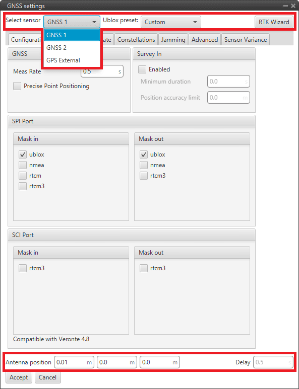 In case the user has selected GNSS 1 or GNSS 2, the internal GPS of the Veronte Autopilot 1x has a default delay of 0.5 seconds.