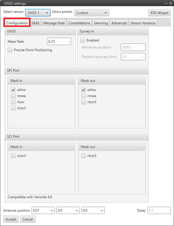Configuration: This menu contains some of the parameters needed to configure the GNSS 1-2 receiver located in Veronte Autopilot 1x.
