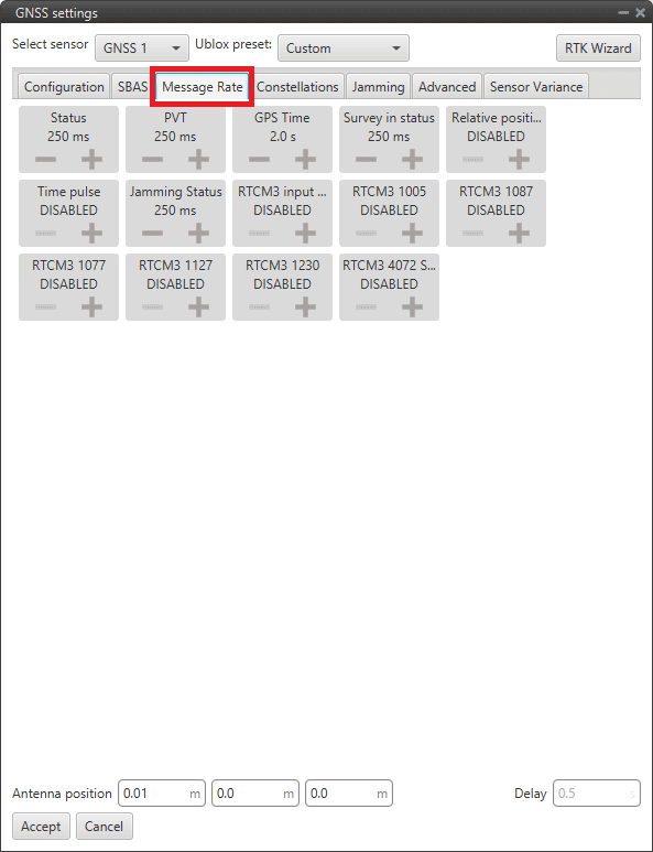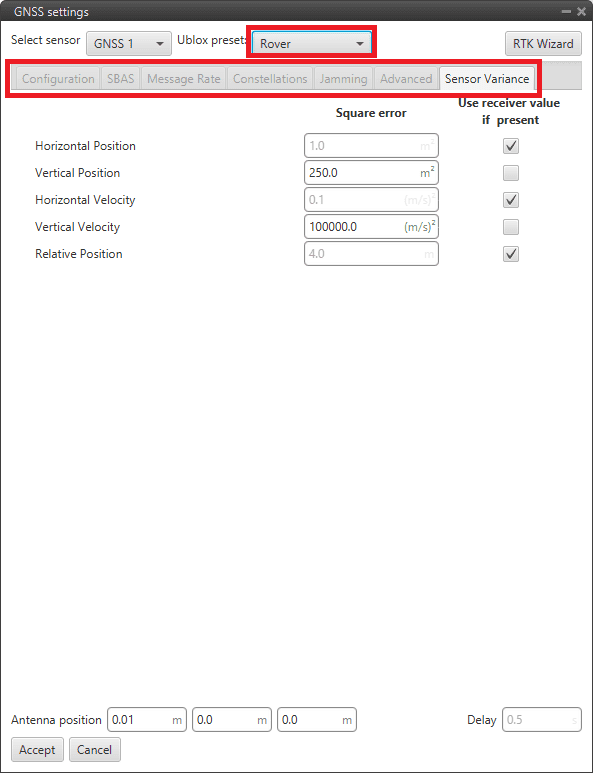 Ublox preset: By default, Custom is selected. If an option other than Custom is selected, users will only be able to configure the 'Sensor Variance' tab (this tab will be described below).