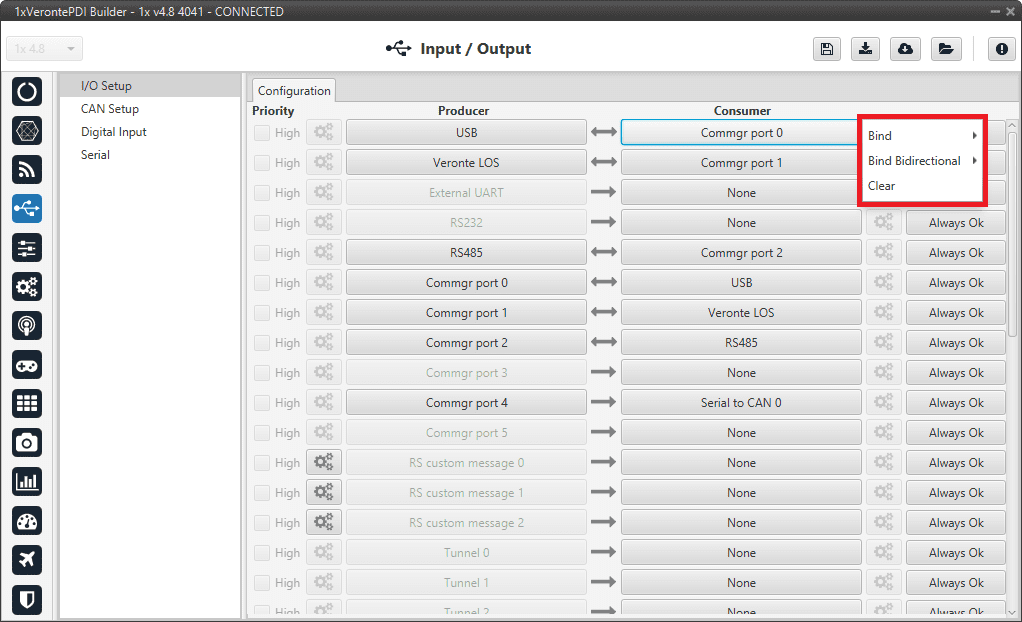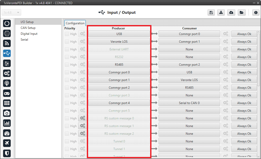Priority: Connections between I/O ports can be marked with high priority with this checkbox. If enabled, they will run at high frequency: 1000 Hz. The following table shows which connections can be selected as high or low priority (marked with S) and which connections are always marked as high (marked with H), so they cannot change to low priority. Producer\Consumer USB Veronte LOS External UART RS232 RS485 Commgr port 0-5 RS custom message 0-2 Tunnel 0-2 GPS 0-1 RTCM External HMR2300 magnetometer Y 0-2 splitter Iridium Vectornav VN-300 Unescape port Serial to CAN 0-5 CAN unwrapper 0-1 NMEA parser Veronte LTE Veronte LTE Auxiliary External ultrasound USB S S S S S H S S H S S S S S S H Veronte LOS S S S S S H S S H S S S S S S H External UART S S S S S H S S H S S S S S S H RS232 S S S S S H S S H S S S S S S H RS485 S S S S S H S S H S S S S S S H Commgr port 0-5 RS custom message 0-2 Tunnel 0-2 S S S S S S H S S H S S S S S S H GPS 0-1 RTCM S S S S S S H S H H External HMR2300 magnetometer S S S S S S S H S H Y 0-2 splitter A-B S S S S S S H S S H S S S S S S H Iridium S S S S S S H S H S S H Unescape port S S S S S S H S S H S S S S S H CAN to serial 0-5 S S S S S S H S S H S S S S S S H CAN wrapper 0-1 S S S S S S H S S H S S S S S S H Veronte LTE S S S S S S H S S H S S S S S H Veronte LTE Auxiliary S S S S S S H S S H S S S S S H