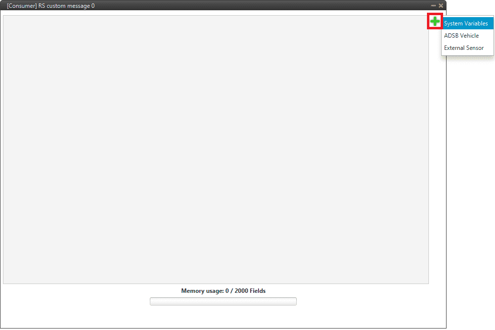 Press the configuration button (  icon) and a pop-up window will be displayed. icon) and a pop-up window will be displayed.In this window press the  icon to add a custom message, the user can choose between System variables, ADSB Vehicle or External Sensor. icon to add a custom message, the user can choose between System variables, ADSB Vehicle or External Sensor.  Serial Custom Message configuration Note The difference between choosing System Variables, ADSB Vehicle or External Sensor is that when the user selects Variable as the custom message type, only system variables will appear when System Variables is selected, only ADSB variables when ADSB Vehicle is selected and only variables related to external sensors if External Sensor is selected.