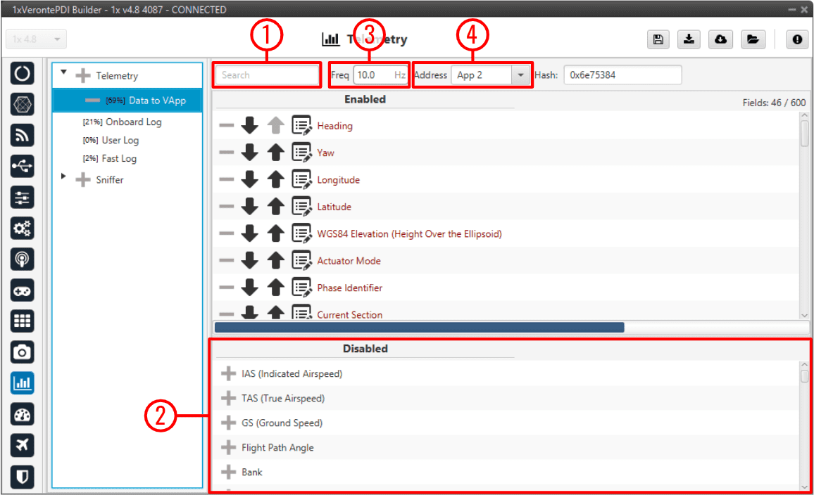 By default, 1x PDI Builder generates a Data vector to send telemetry from the configured Autopilot 1x to the Address 2 (Veronte applications). The variables indicated in red in a Data vector are required for correct operation.