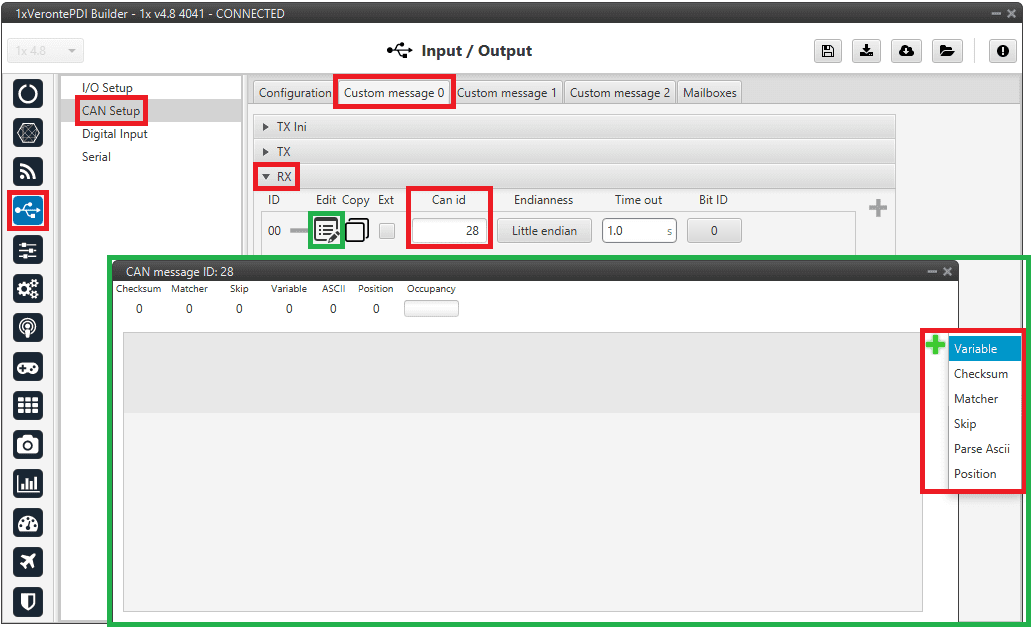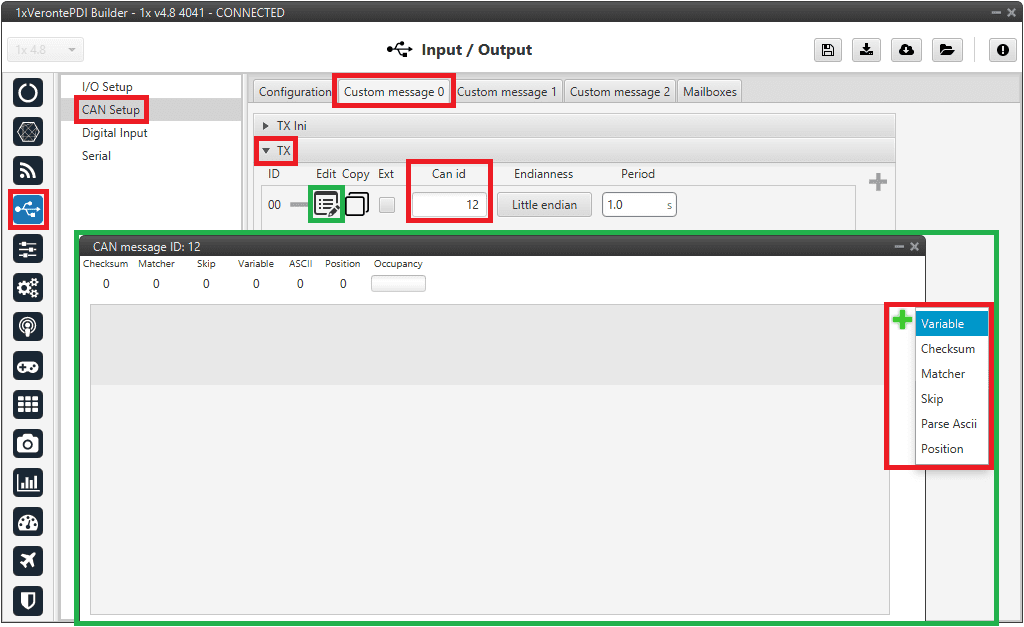 Go to Input/Output menu CAN Setup panel Custom message 0 tab.