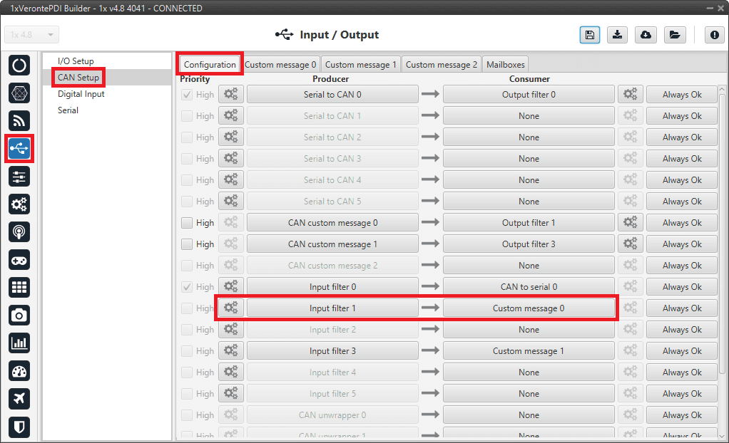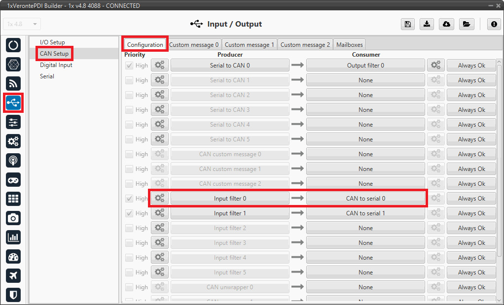Connect an Input filter producer to a CAN to serial consumer. In this example, Input filter 0 has been connected to CAN to serial 0.