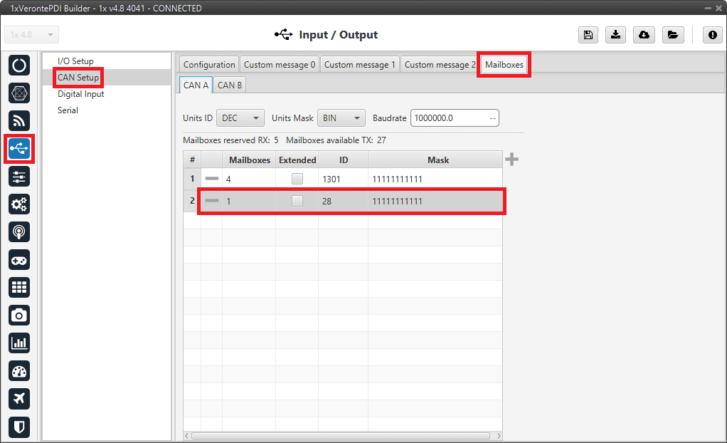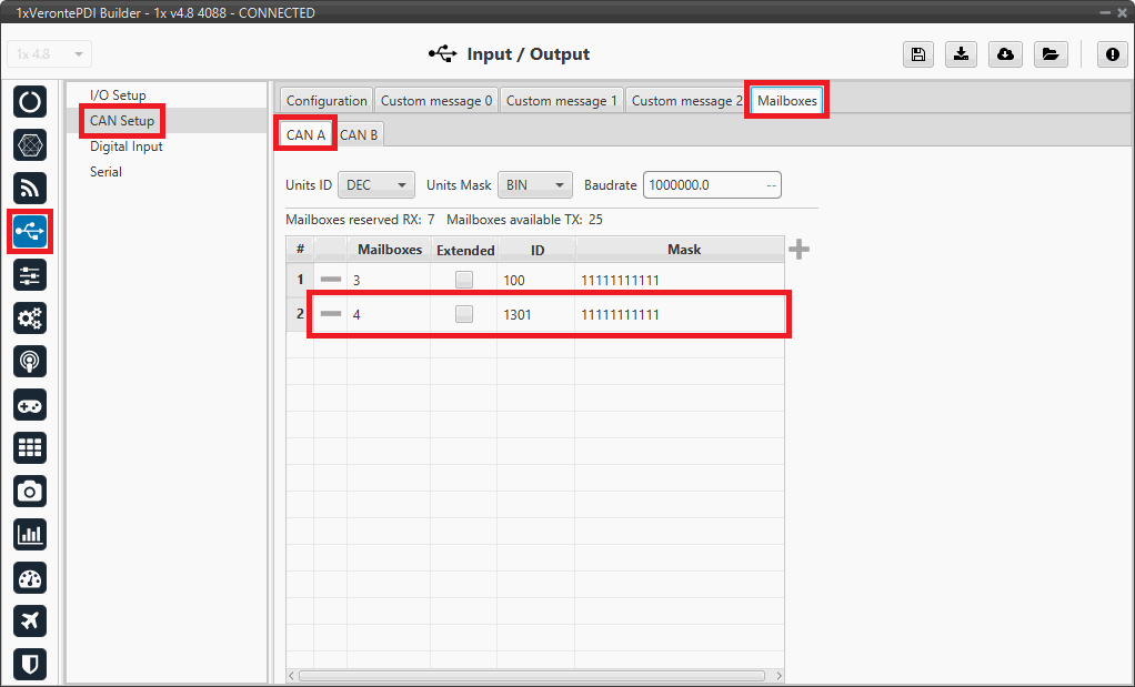 Go to Input/Output menu CAN Setup panel Mailboxes tab.