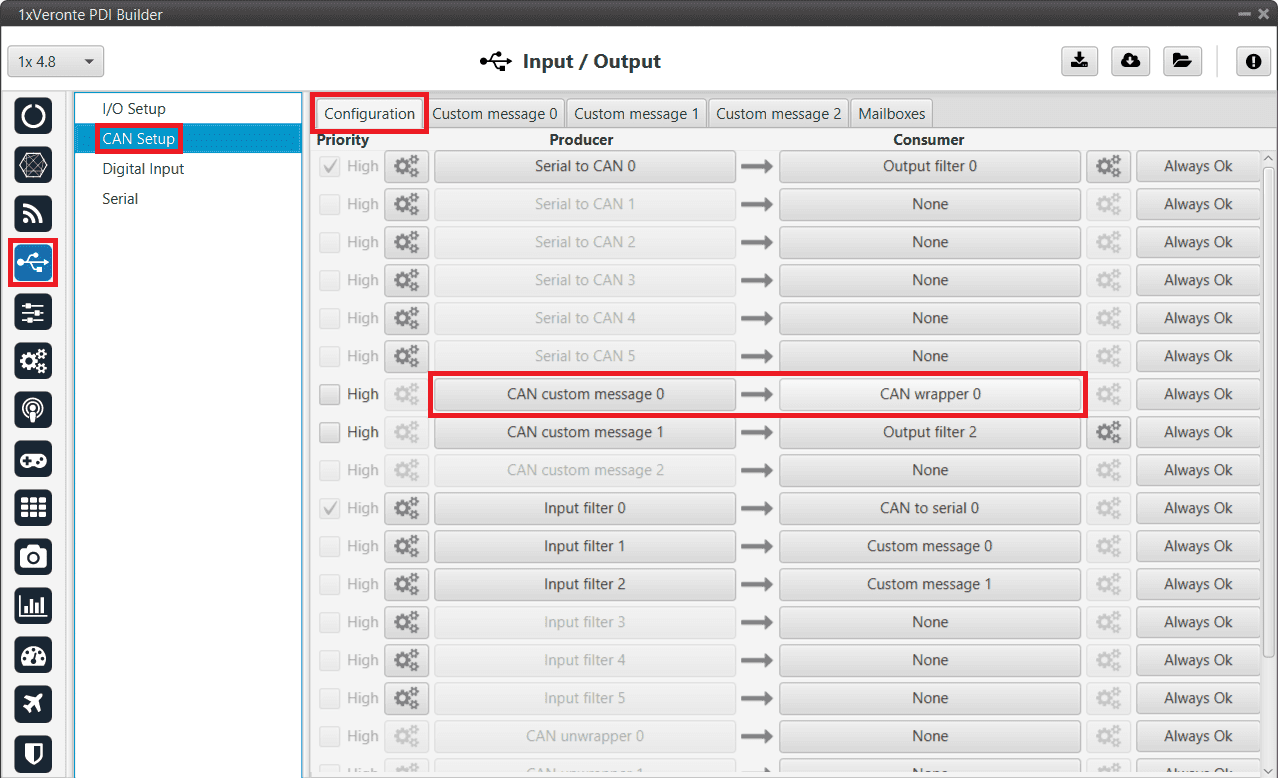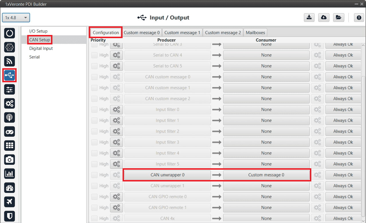 Go to Input/Output menu CAN Setup panel Custom message 0 tab (as Custom Message 0 has been selected as consumer).