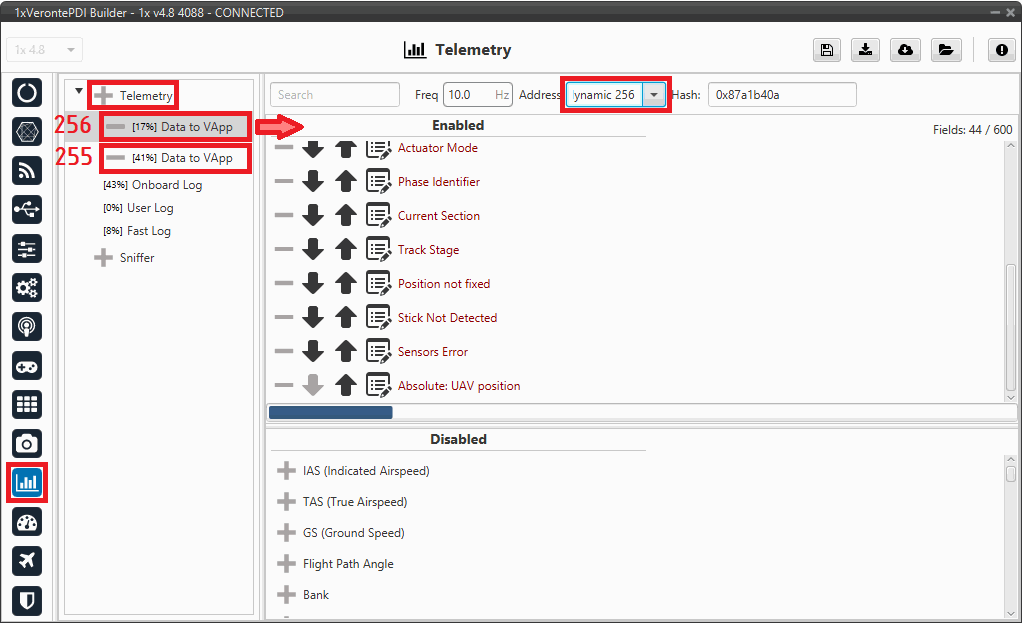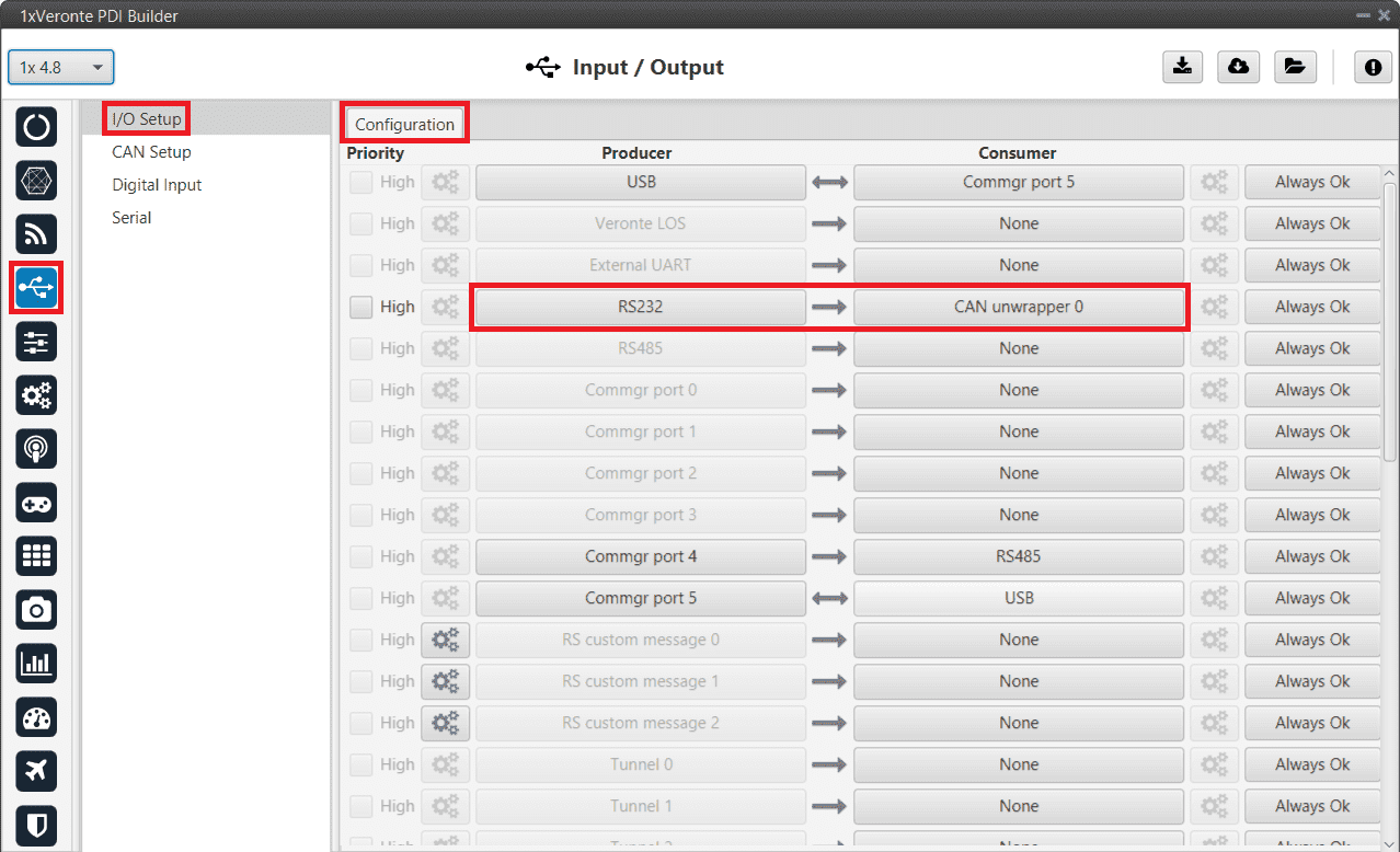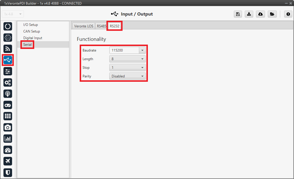 Since Veronte Autopilot 1x can be connected to a computer via a USB or serial interface, the configuration for both connections is already set by default in 1x PDI Builder.