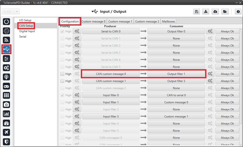 Connect CAN custom message 0 producer (as the message has been configured in the Custom Message 0 tab) to an Output filter as follows: