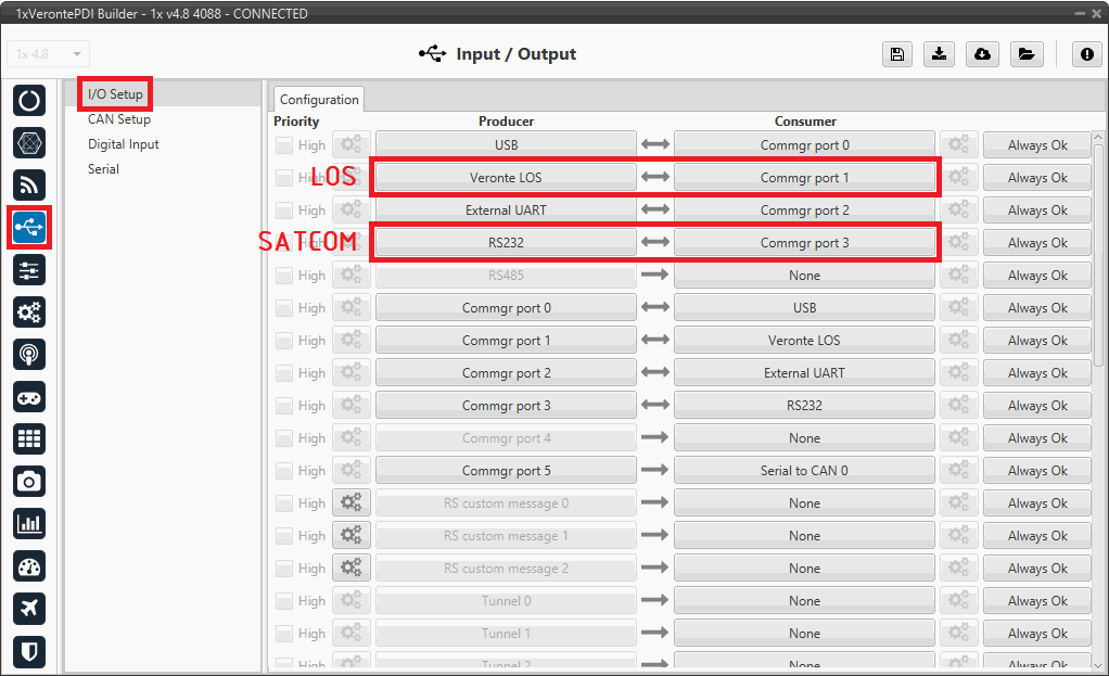 Serial ports: Veronte LOS, RS232, RS485 and External UART