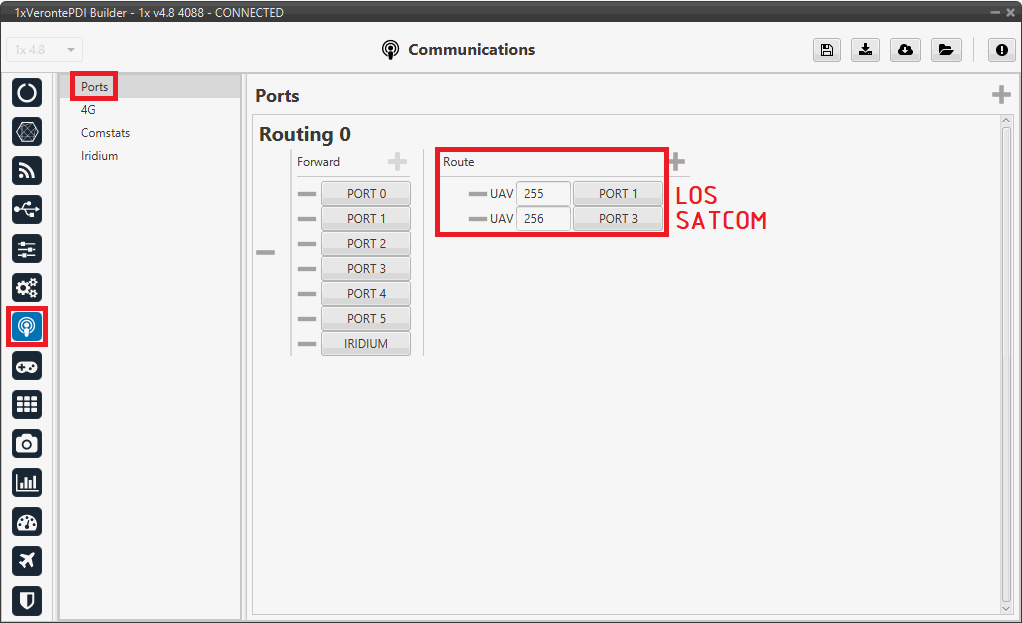 This way, any messages that are received through a Commgr Port (i.e. through Veronte LOS) with Address 2, will be re-routed through Port 0 (USB) and received by Veronte Link/Ops software, including any messages generated by 1x ground unit itself.