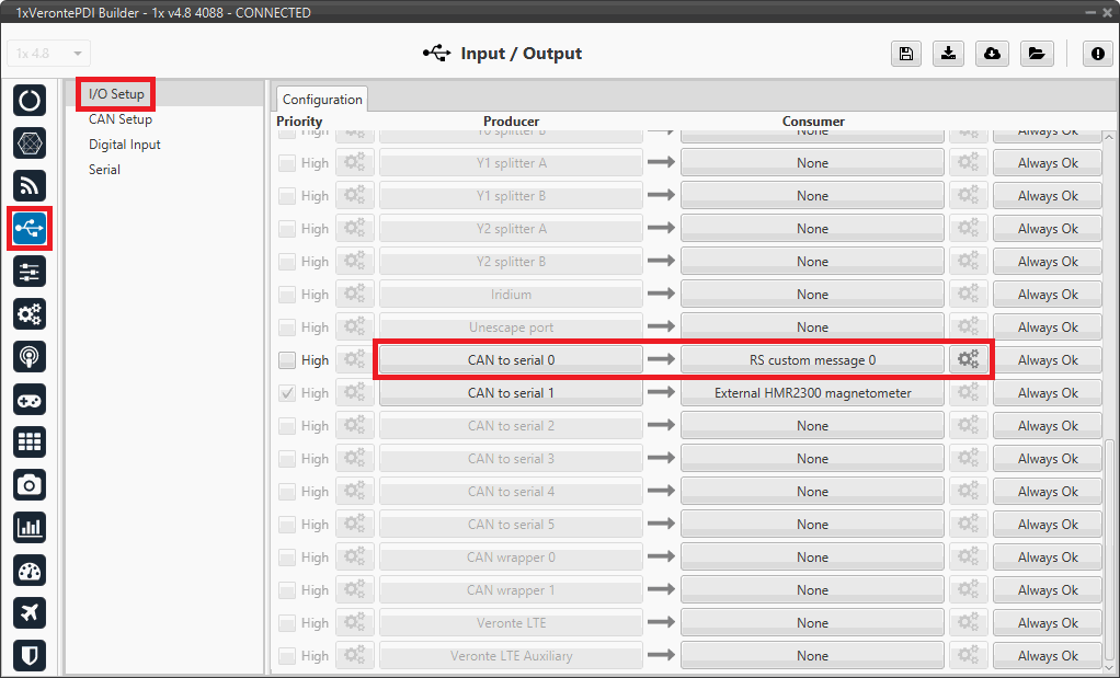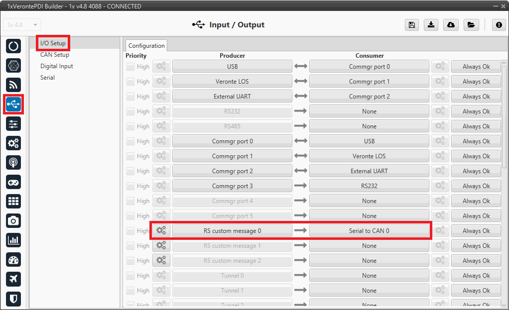 Connect the CAN to serial 0 producer to a RS custom message consumer, in this example RS custom message 0 has been chosen.