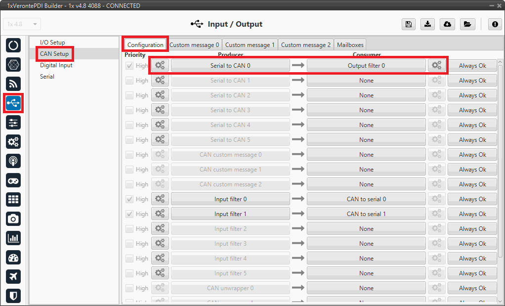 Connect the Serial to CAN 0 producer to an Output filter consumer, in this case Output filter 0 has been chosen.