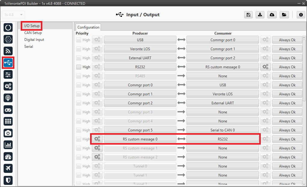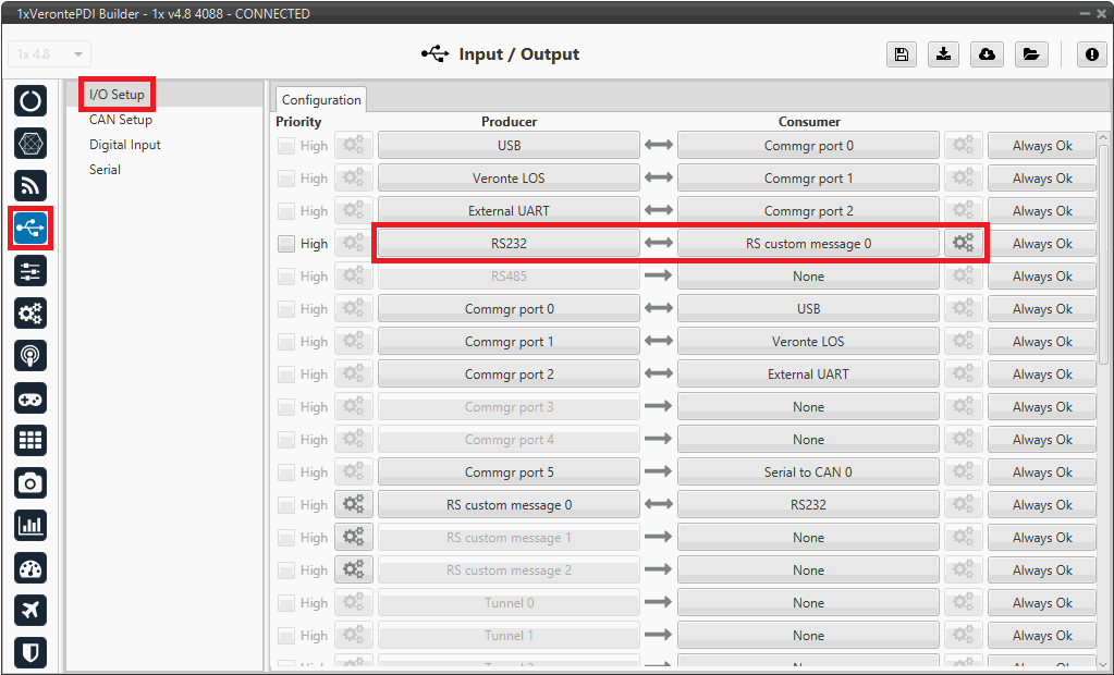 Connect the RS232 producer to a RS custom message consumer, in this example RS custom message 0 is selected: