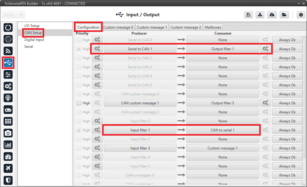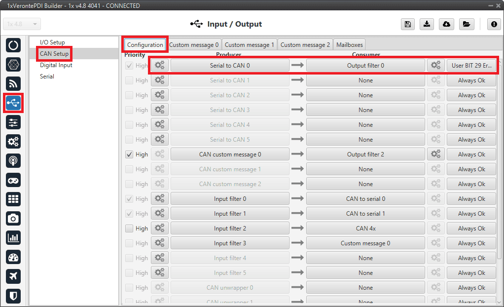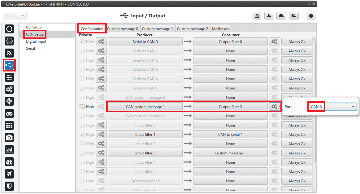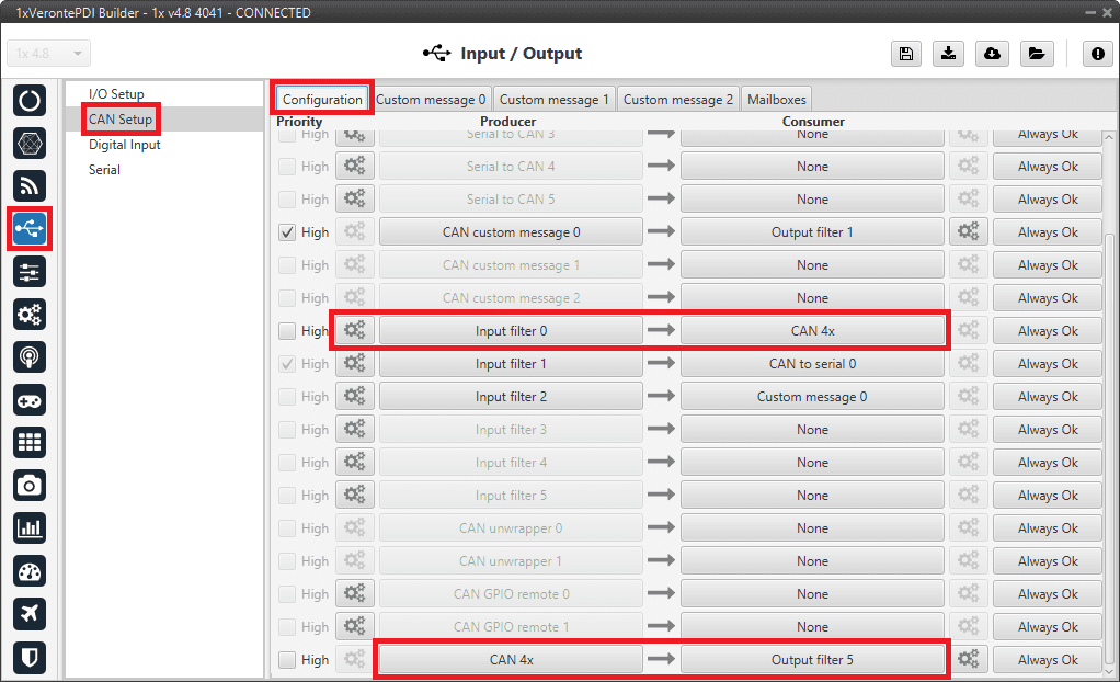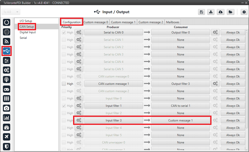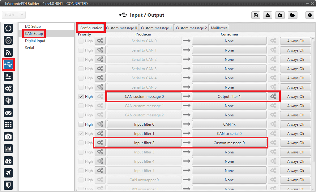 Connect CAN custom message 0 producer to an Output filter consumer, in this example Output filter 1.