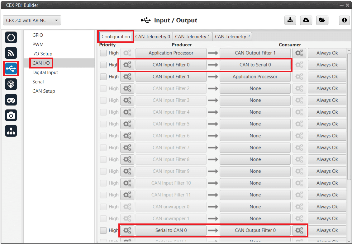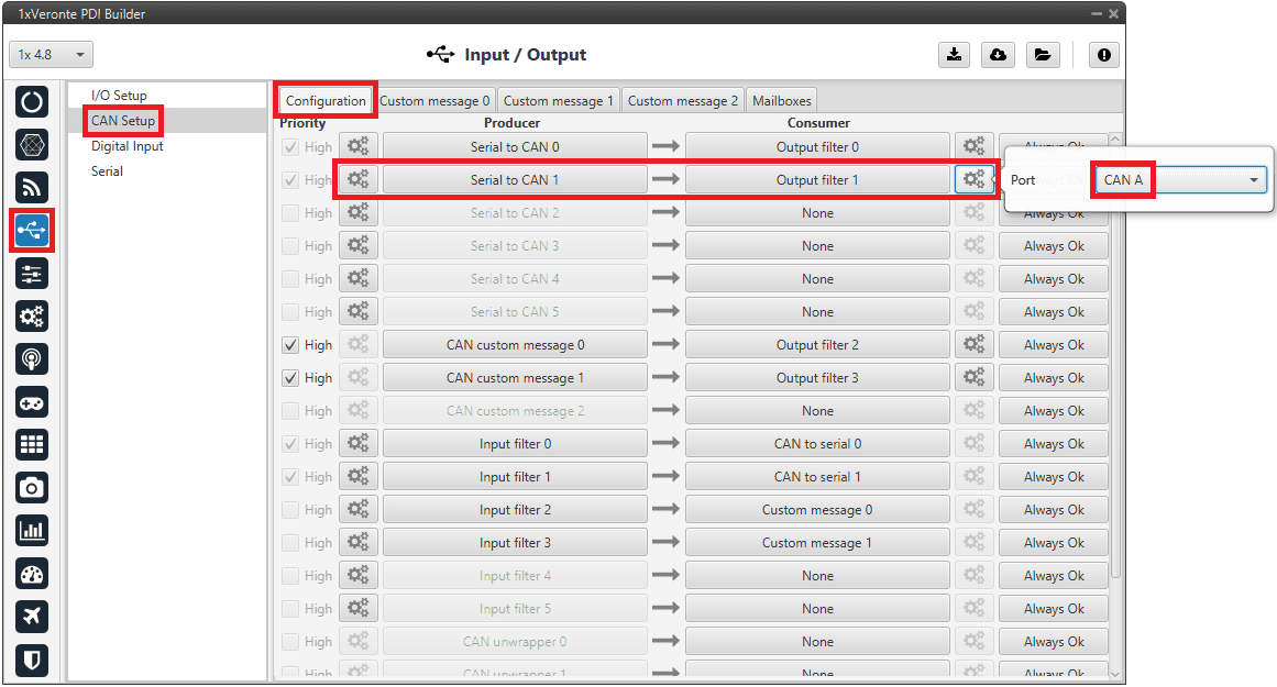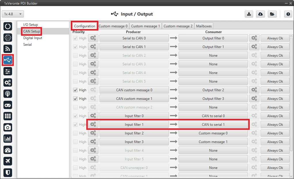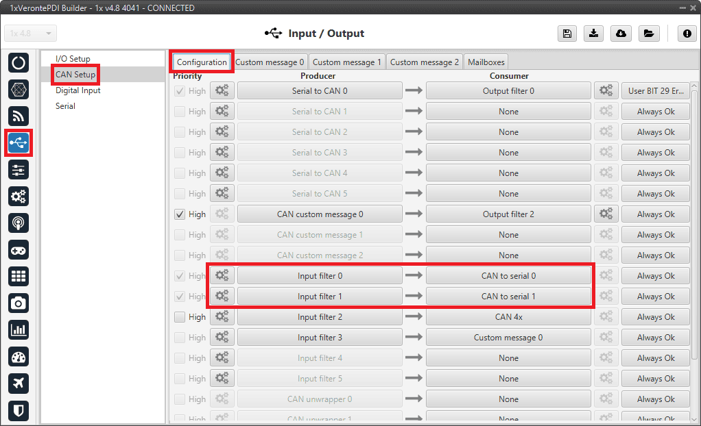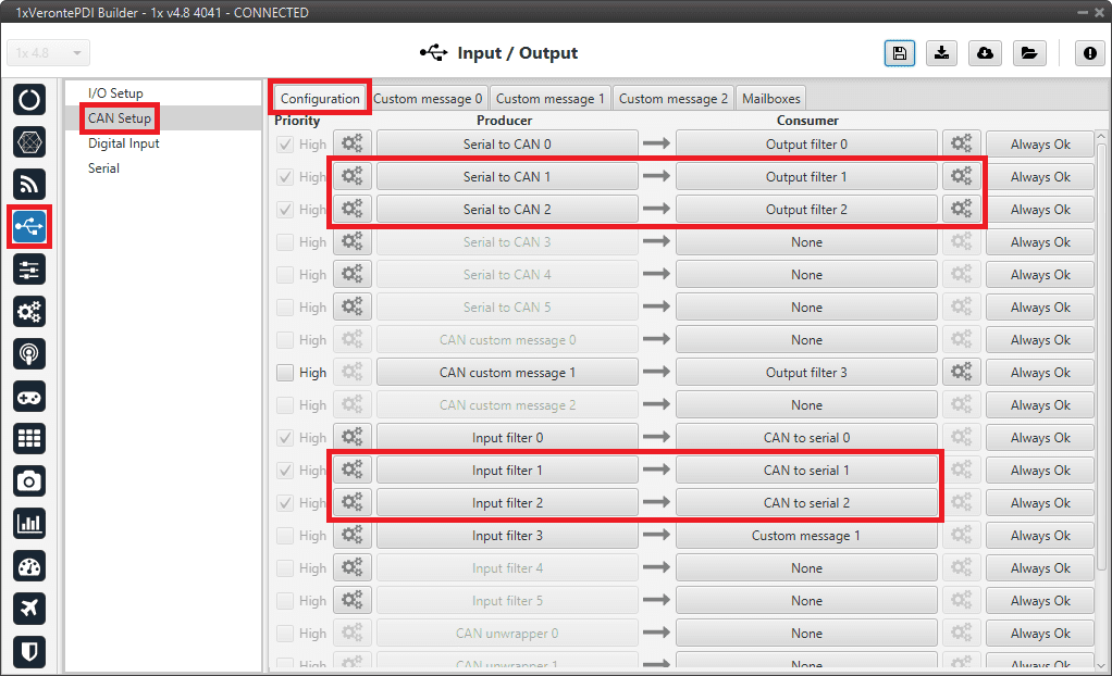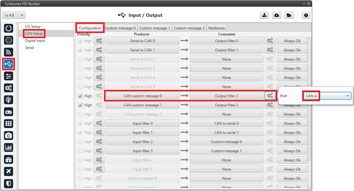 Connect CAN custom message 0 producer to an Output filter consumer, in this example Output filter 1.