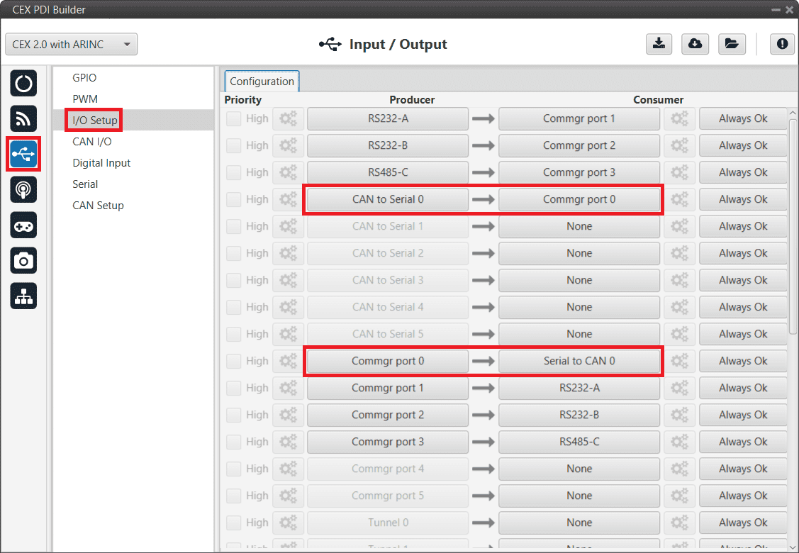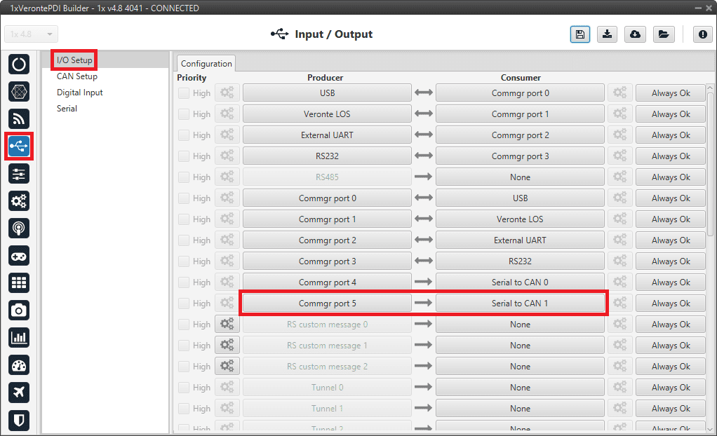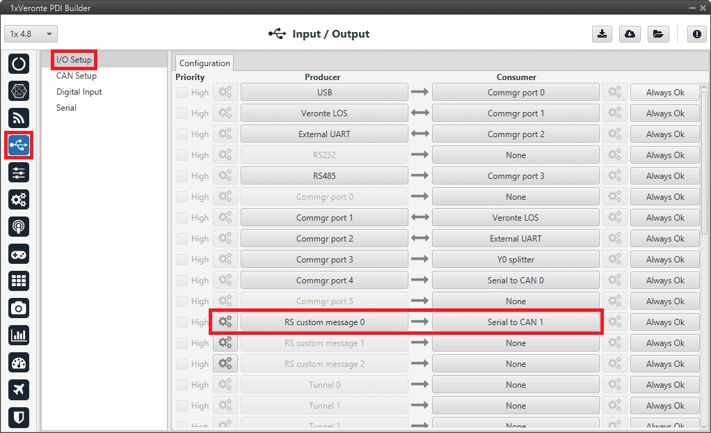 A RS custom message producer is connected to a Serial to CAN consumer. In this example, RS custom message 0 is connected to Serial to CAN 1.