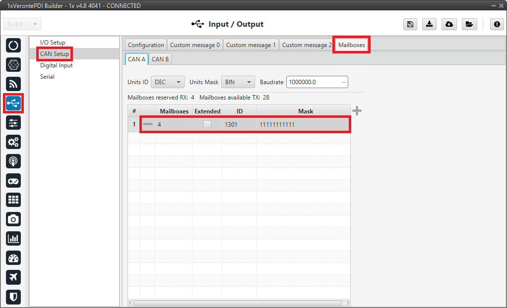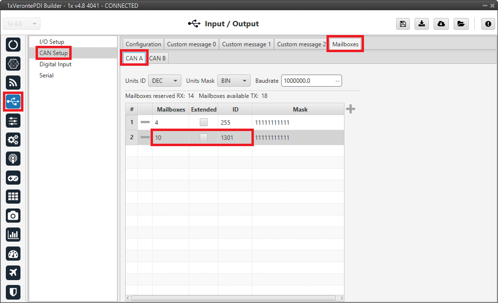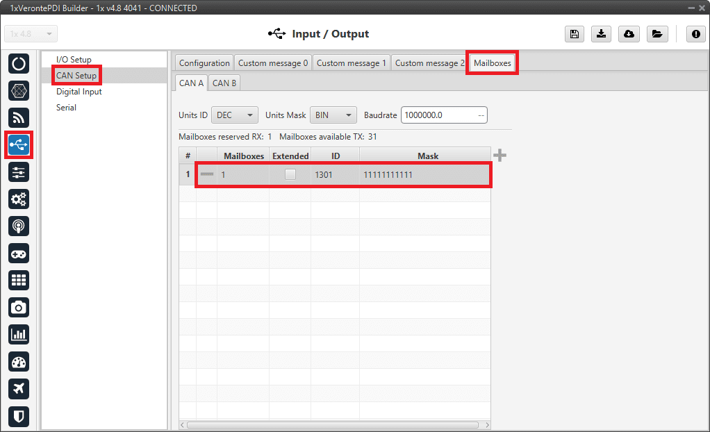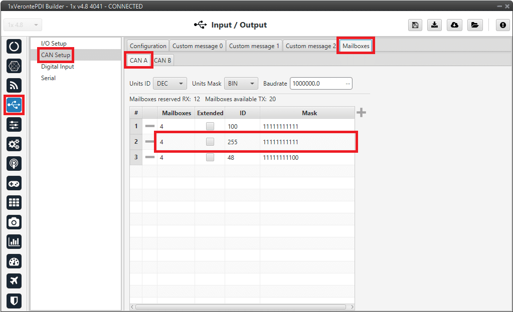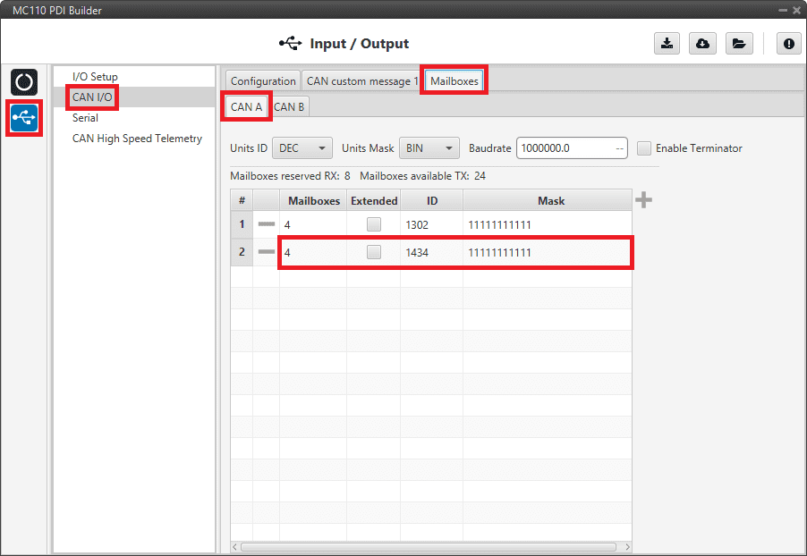 1x PDI Builder - Mailboxes configuration For more information on mailboxes, see the Mailboxes (CAN Setup) - Input/Output section of this manual.