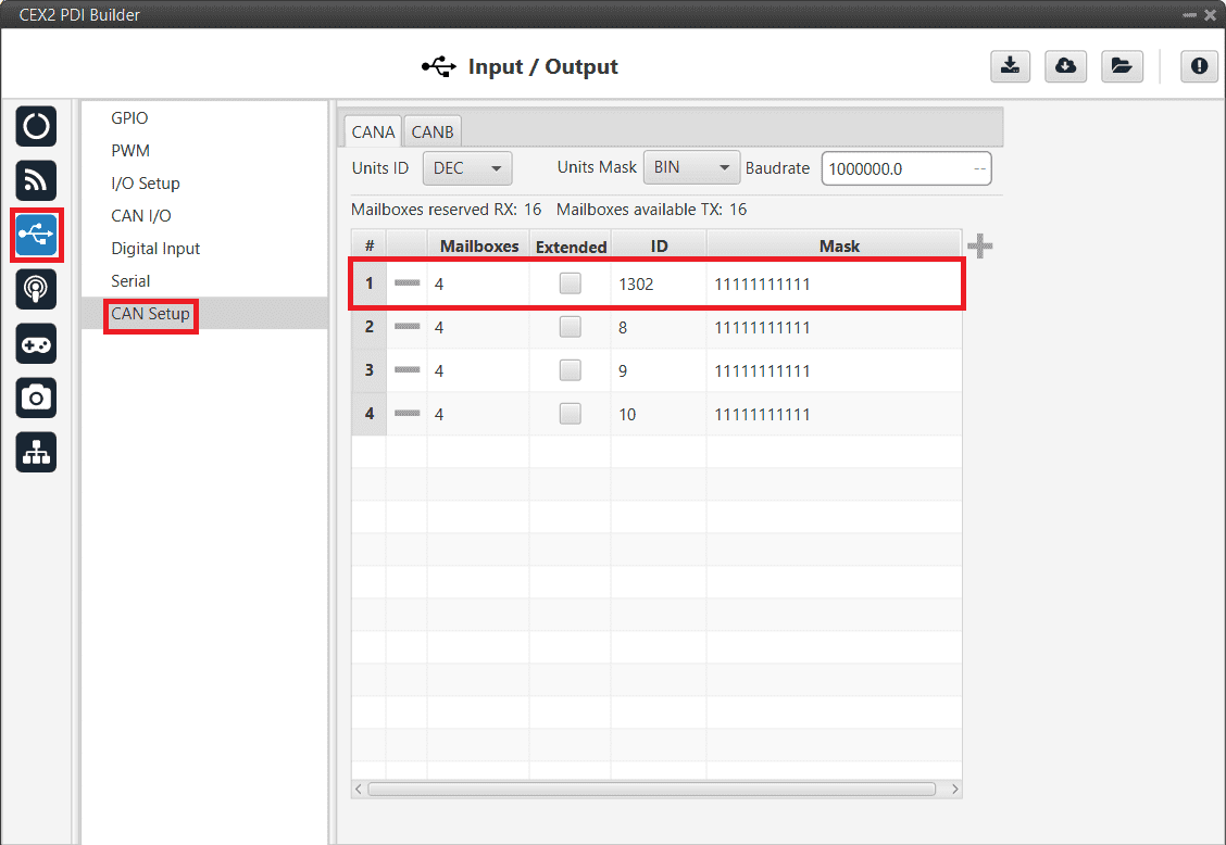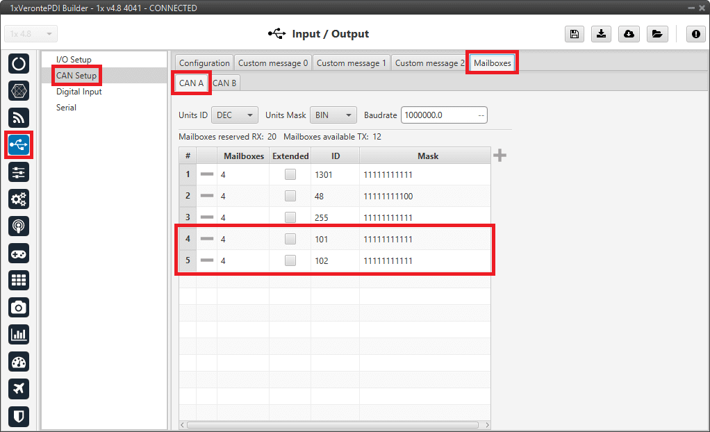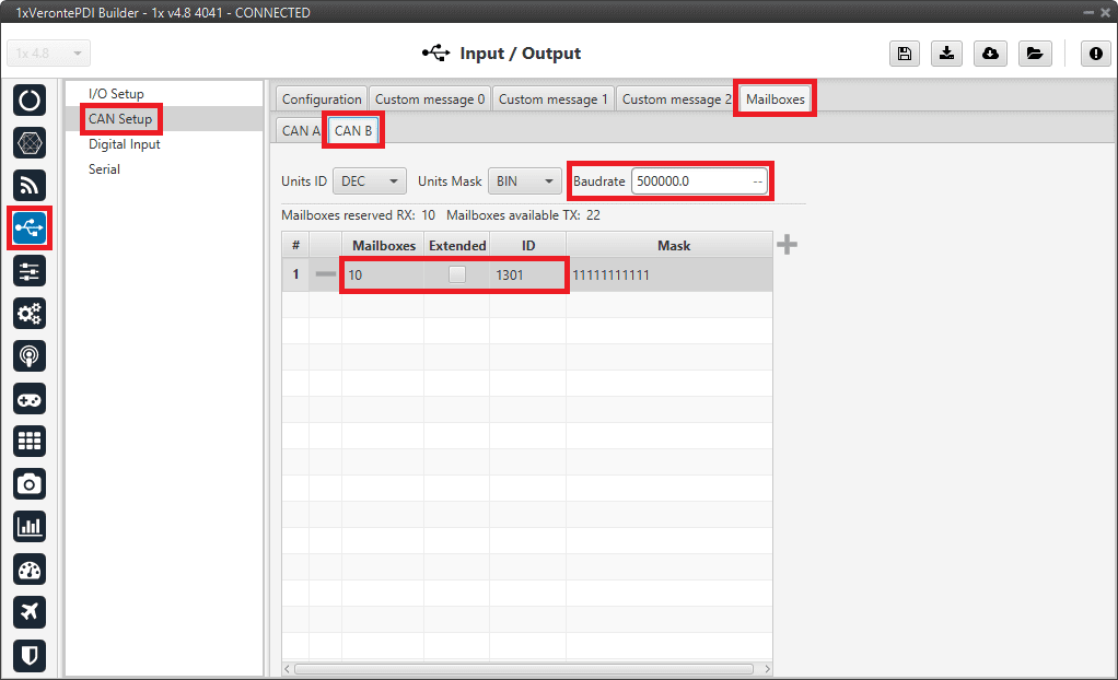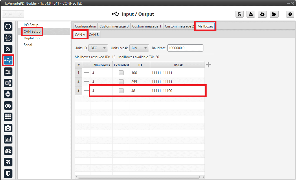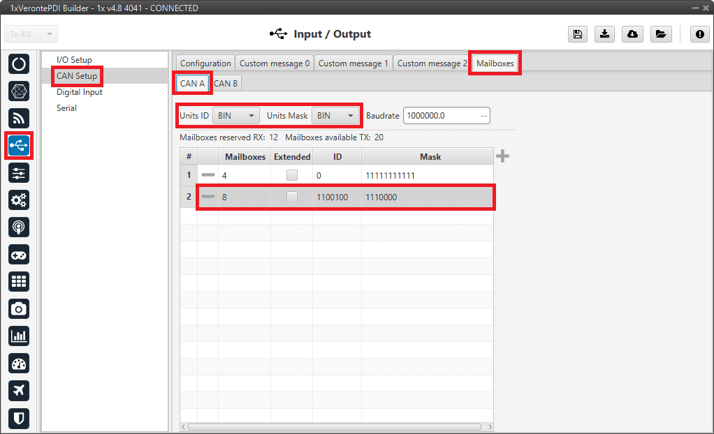1x PDI Builder - Mailboxes configuration For more information on mailboxes, see the Mailboxes (CAN Setup) - Input/Output section of this manual.