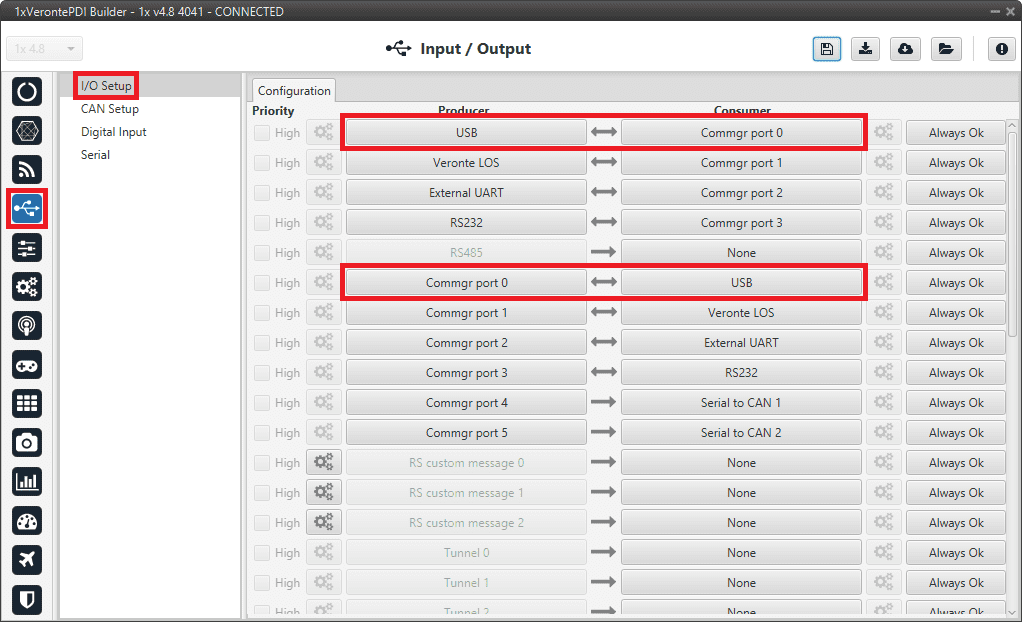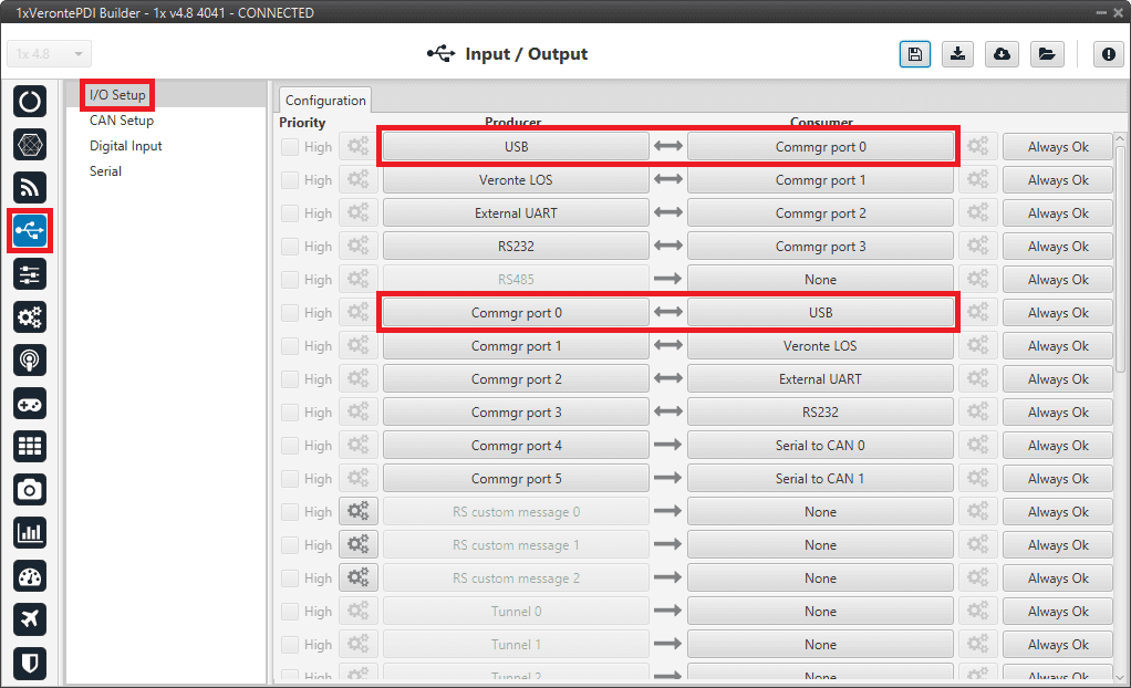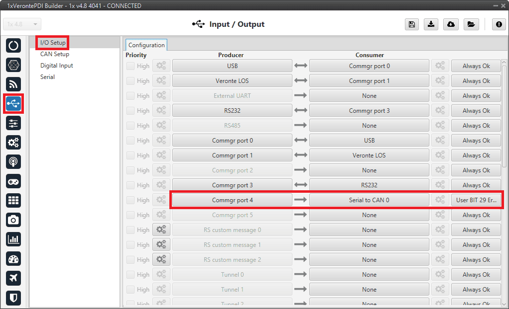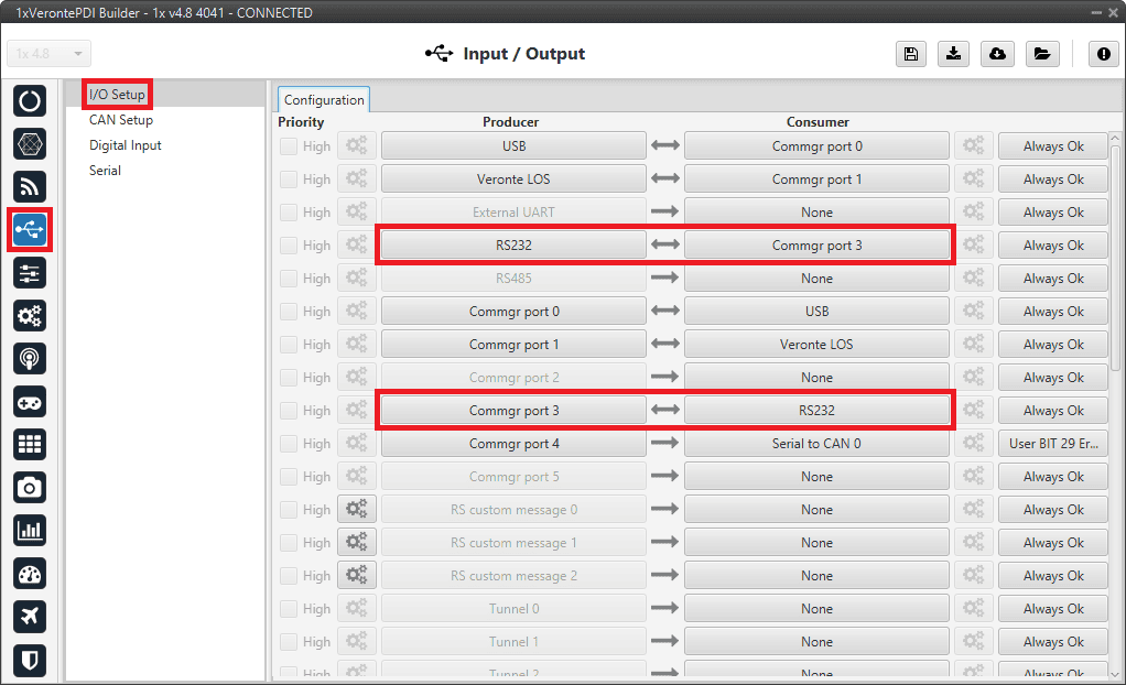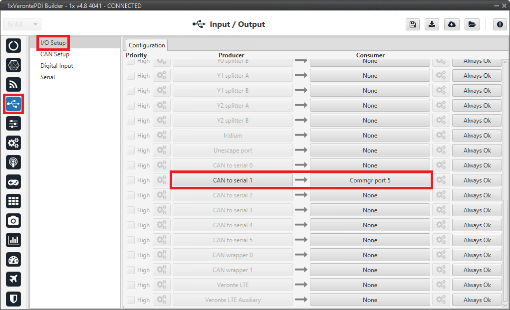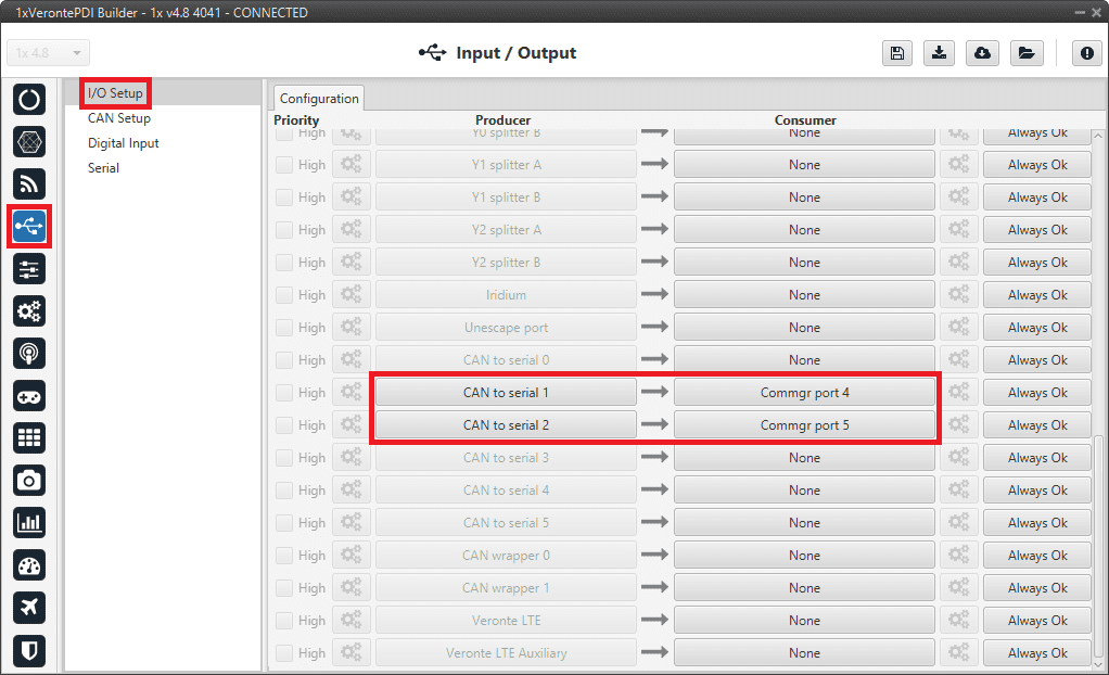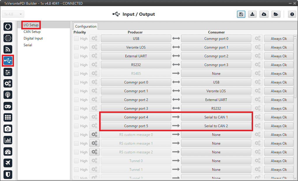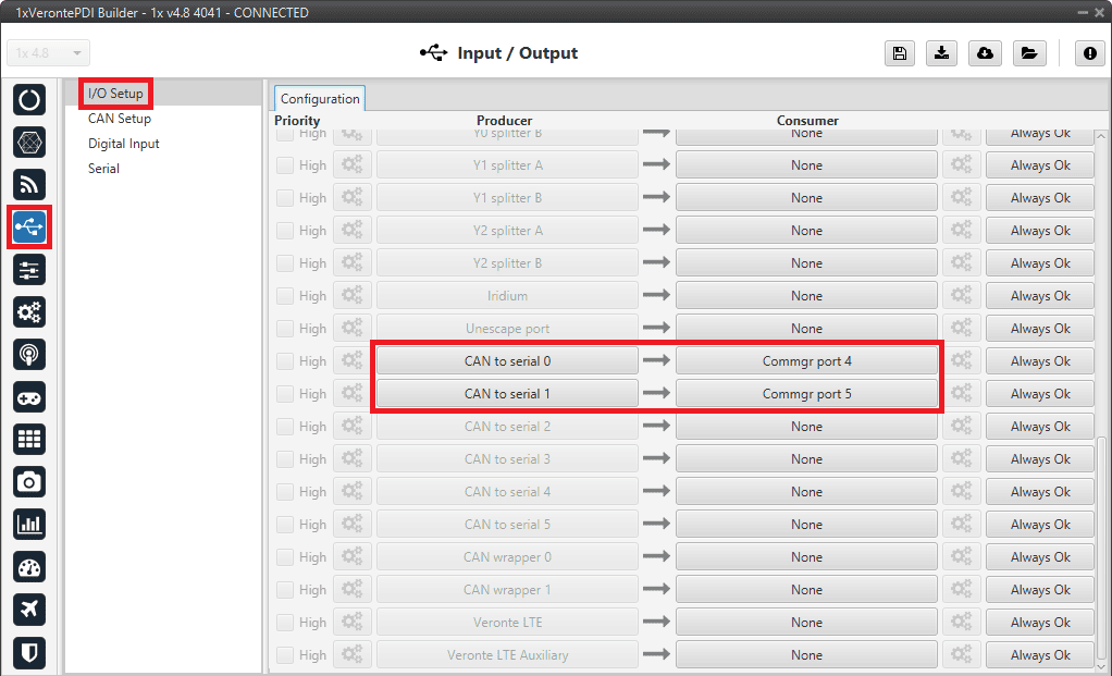 Veronte Gimbal - I/O Setup configuration panel Click on