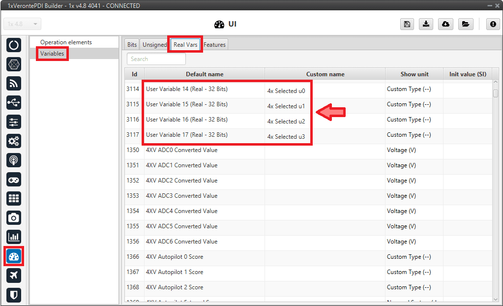Example of AP Selection block connection to several Control Outputs These users variables have been previously renamed in the UI menu Variables panel Real Vars tab: