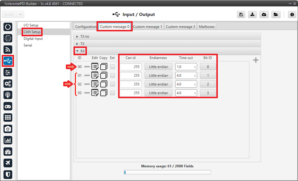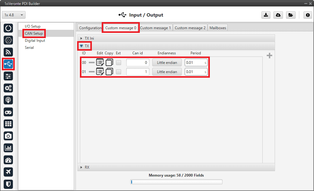 1x PDI Builder - Custom message 1 configuration For more information on configuring CAN custom messages, refer to the Custom Messages types - Input/Output section of this manual.