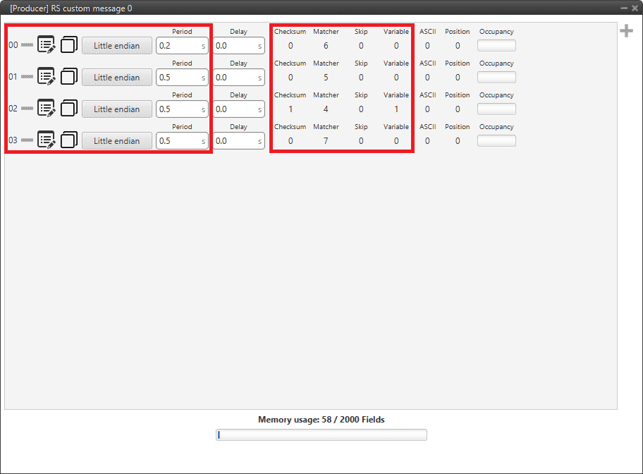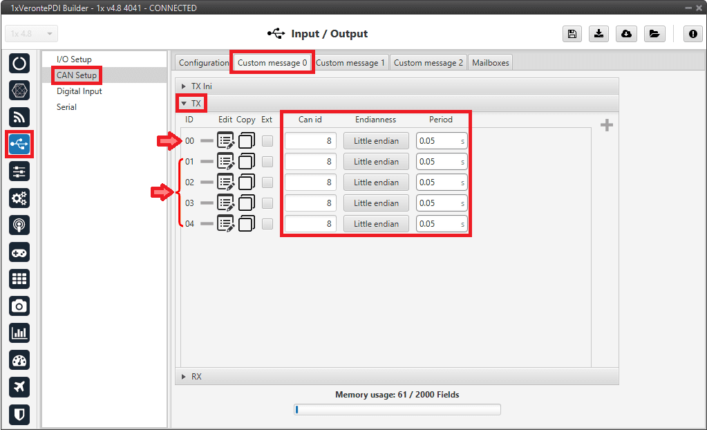 In this example, 5 messages with CAN ID 8 (arbitration Id of the AP 0), Little endian and Period 0.05 s have been added. More information on CAN messages configuration can be found in the TX/TX Ini Messages (Custom Messages) - Input/Output section of this manual.