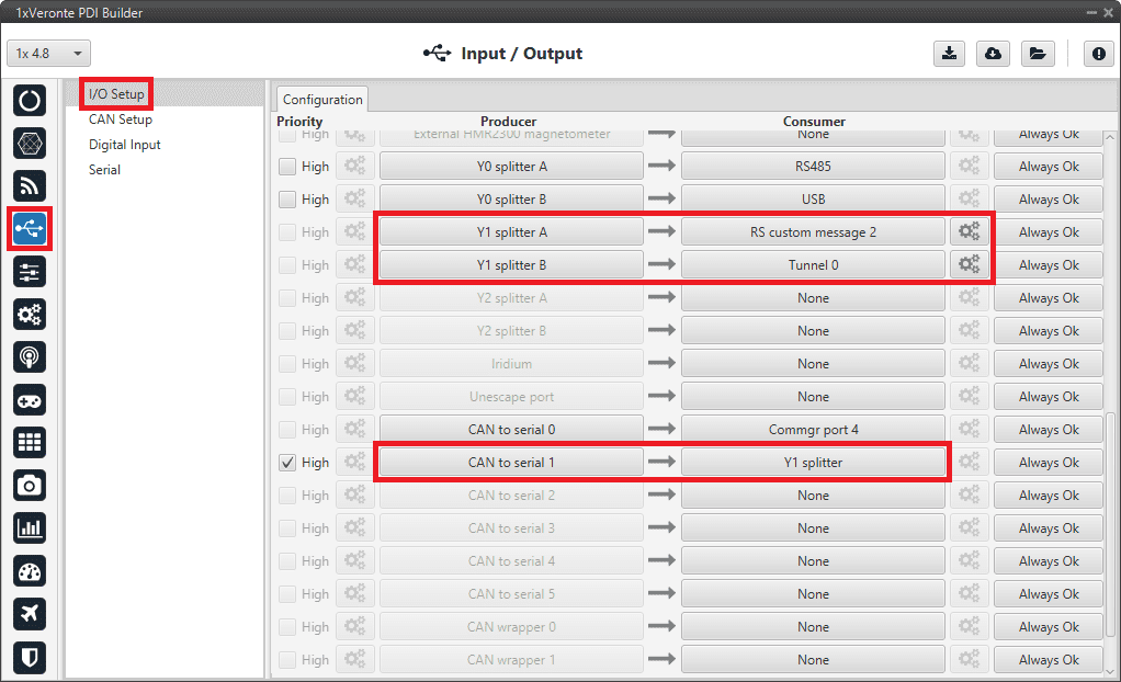 In this example, CAN to serial 1 is connected to Y1 splitter, Y1 splitter A to RS custom message 2 and Y1 splitter B to Tunnel 0.
