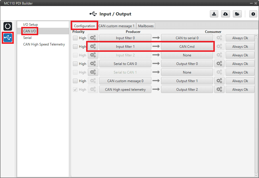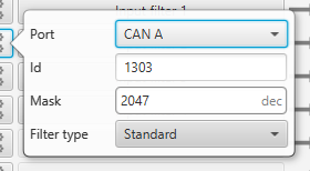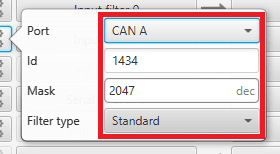1x PDI Builder - CAN Setup configuration In addition, according to the send message set in the MC110 PDI Builder software, configure the input filter with the following parameters: