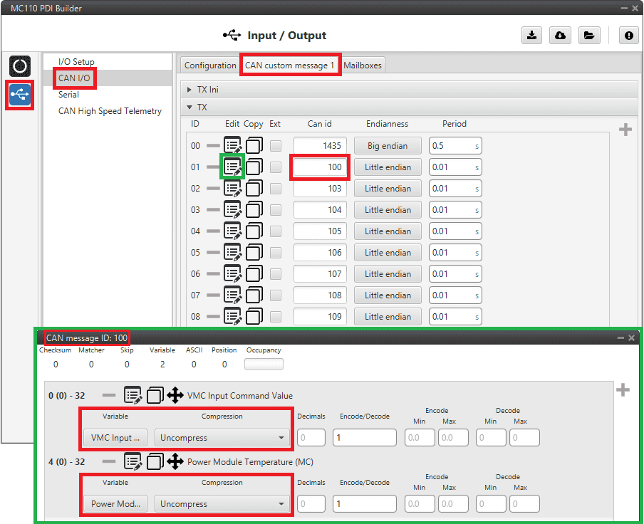 In this example, the message with CAN ID 100 is sending the input command value as well as the board temperature as uncompressed variables.