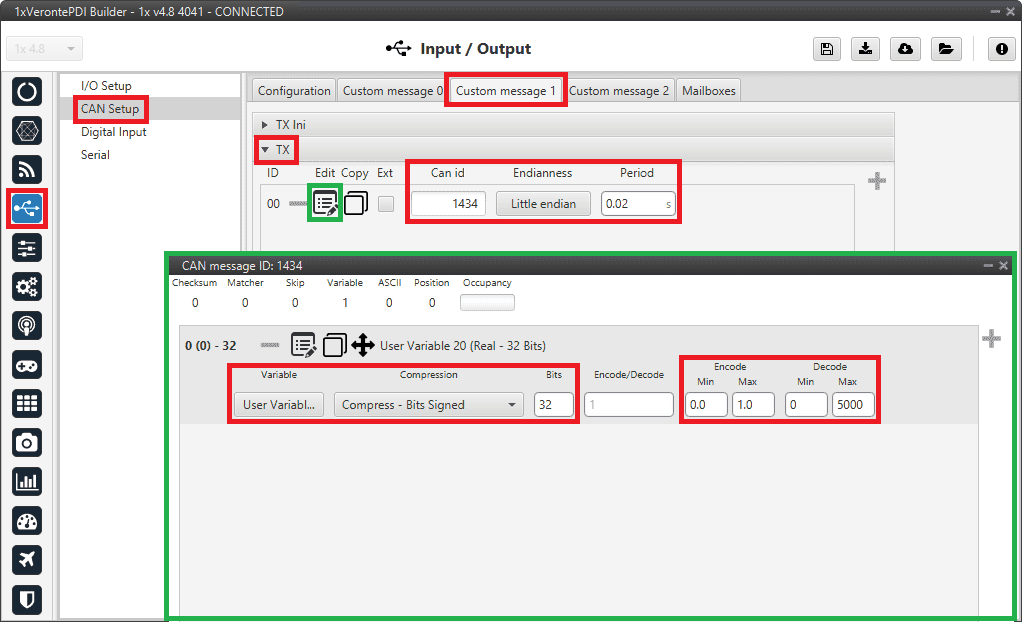 Go to Input/Output menu CAN I/O panel CAN custom message 1 tab.