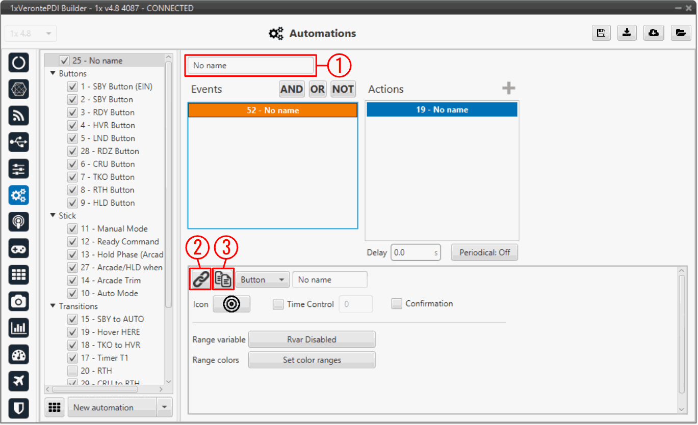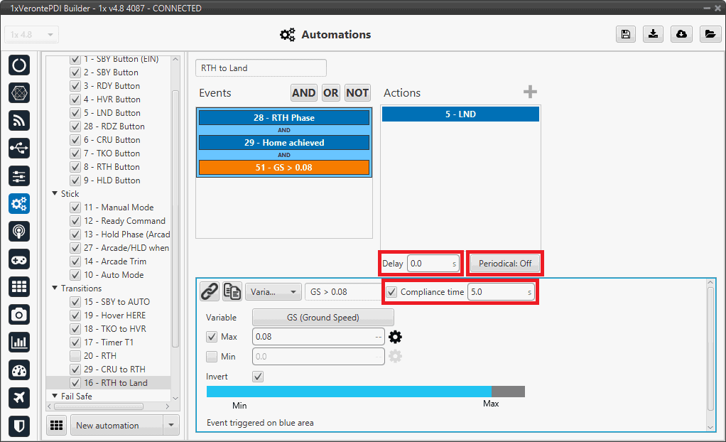 Automations are actions that are carried out when a combination of events happen, i.e when the events are accomplished the action is done. An example of what an automation could be a change of phase when reaching a certain altitude and speed, moving a servo when a button is clicked and many other possible combinations.