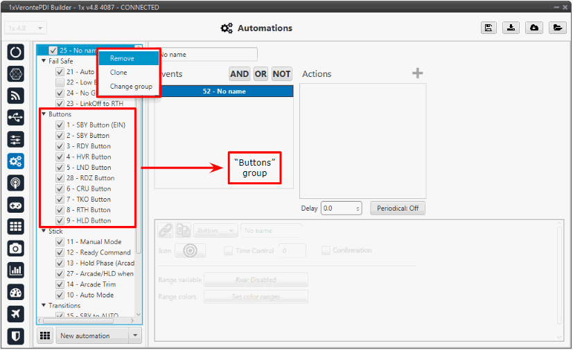 By right clicking on an automation it is possible to remove it, clone it or change it of group. When a group is created, the rest of automations that the user wants to add to the group can be done by drag and drop.