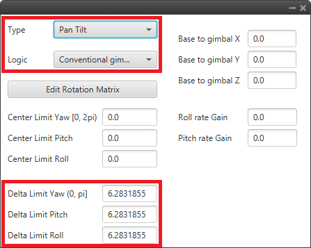 • Delta Limit Yaw [0, pi]/Pitch/Roll: That is how much the gimbal can move in positive and negative from the center defined above.