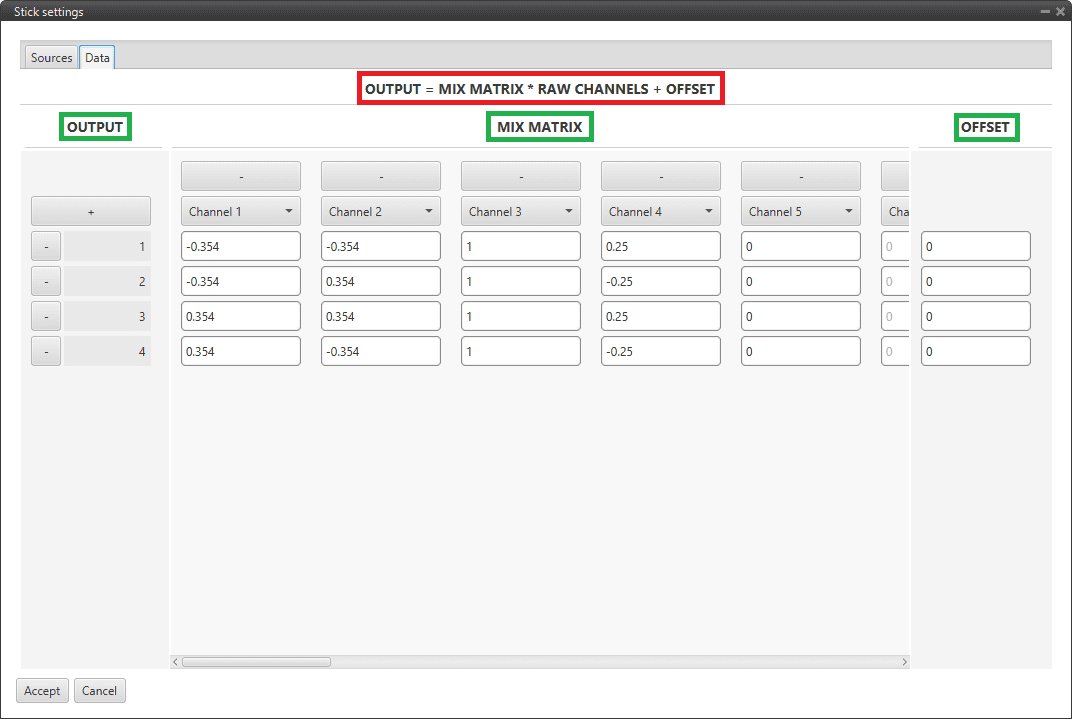 • is a matrix that transforms raw stick inputs to PWM signals .
