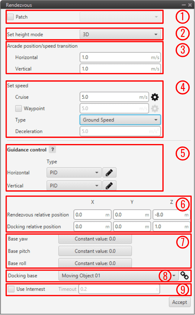 Set speed: This is detailed in the common guidance block parameters, described at the beginning of this section in Guidance blocks common configuration.
