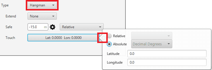Touch: Additional parameter to be configured when the type Hangman is selected. It defines a point that the aircraft has to reach. For instance, after go Up/Down the set value, the aircraft will perform an horizontal movement according to the defined point. Finally, when the aircrafts is over the point, it will descend until reaches that point.