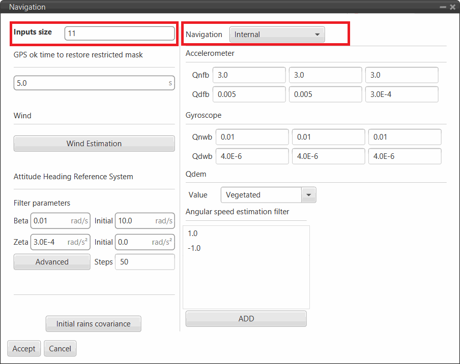 - Qnfb: Noise of the accelerometer. It is used in the states of position and velocity. These values correspond to the diagonal of the acceleration covariance matrix.
