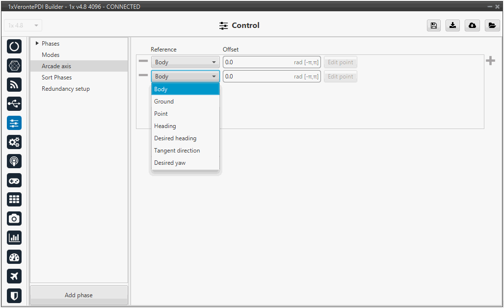 Arcade axis panel enables the option of changing the center of the system axes. This option is used to create axis systems referred to a certain point or direction, for example, it is useful when the pilot wants all movements to be made with respect to them (Ground axes). In this way, if the pilot commands a right turn, the aircraft will turn to the right relative to the pilot, rather than the right relative to the aircraft (Body axes).