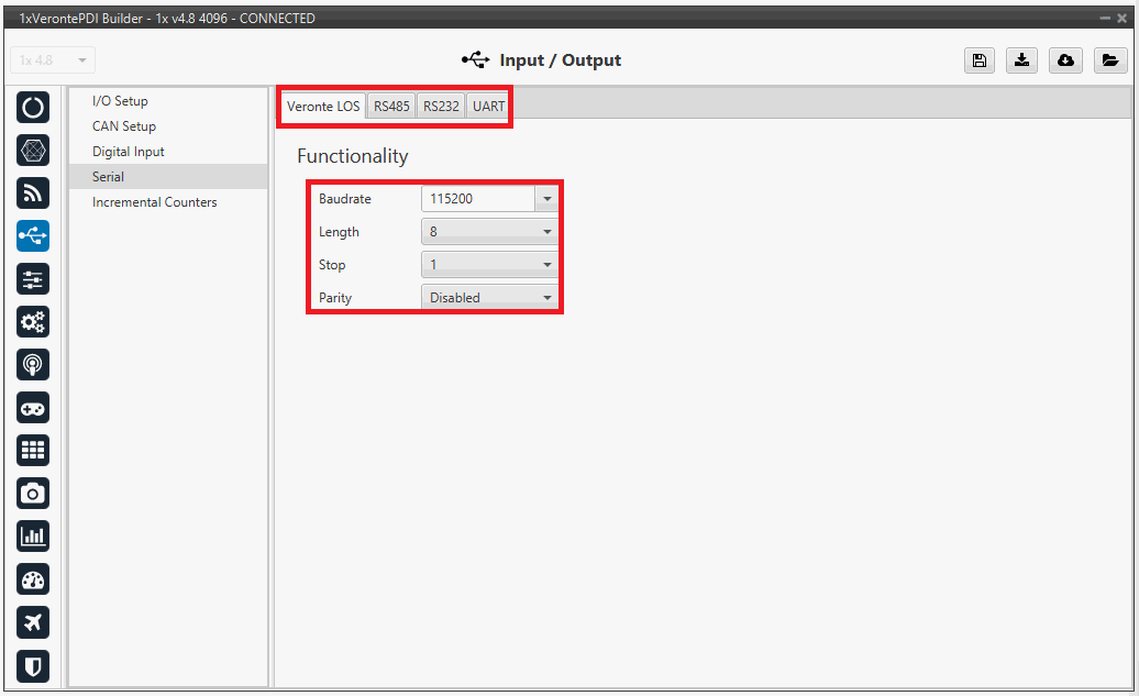 In this panel, users must configure the parameters of the different serial ports, Veronte LOS, RS485 and RS232, in their corresponding tab.