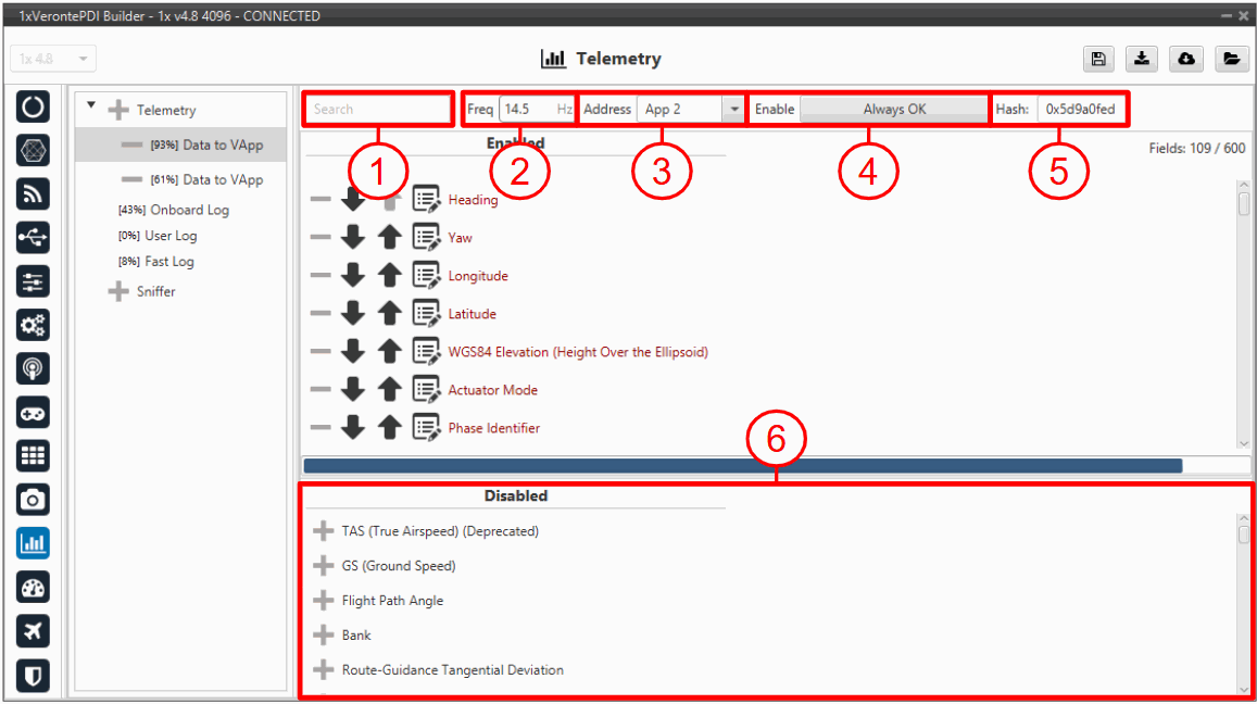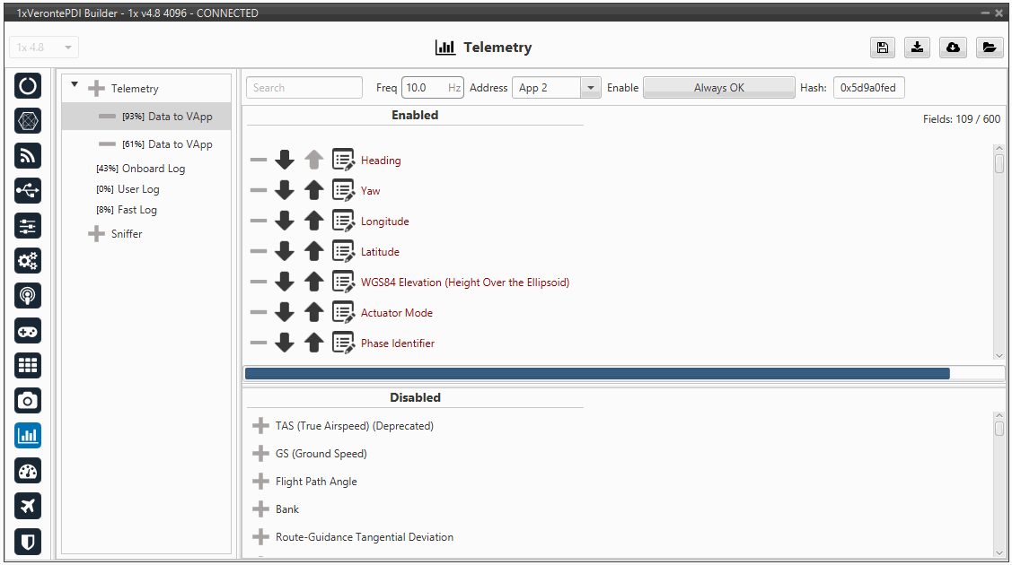 By default, 1x PDI Builder generates a Data vector to send telemetry from the configured Autopilot 1x to the Address 2 (Veronte applications). The variables indicated in red in a Data vector are required for correct operation.