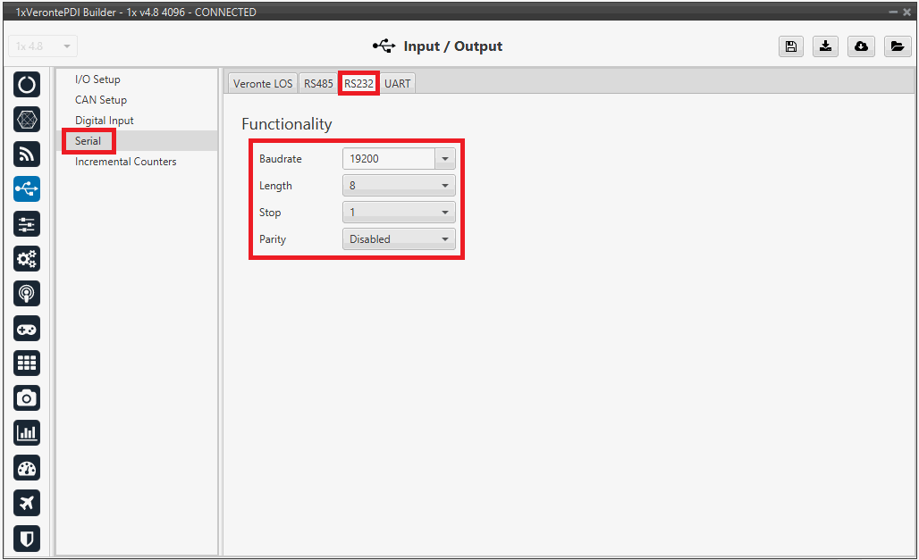 Go to Input/Output menu Serial panel RS232 tab.