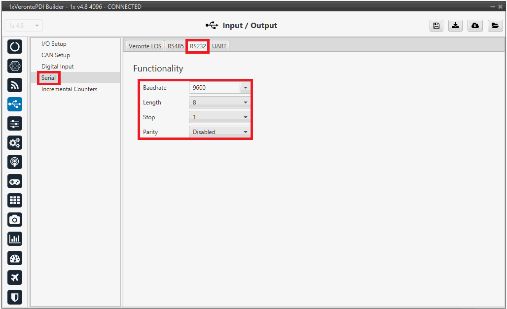 Go to Input/Output menu Serial panel RS232 tab.