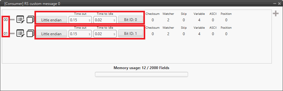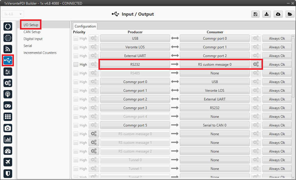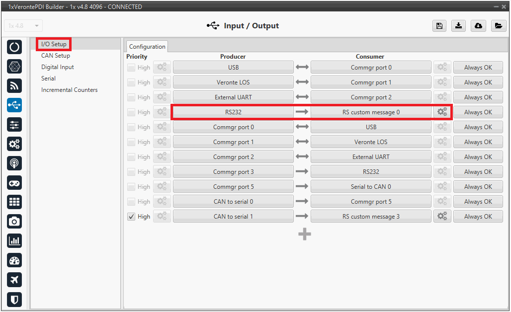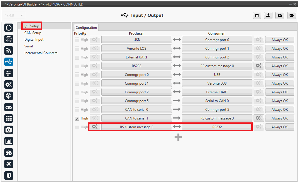 Connect the RS232 producer to a RS custom message consumer, in this example RS custom message 0 is used.