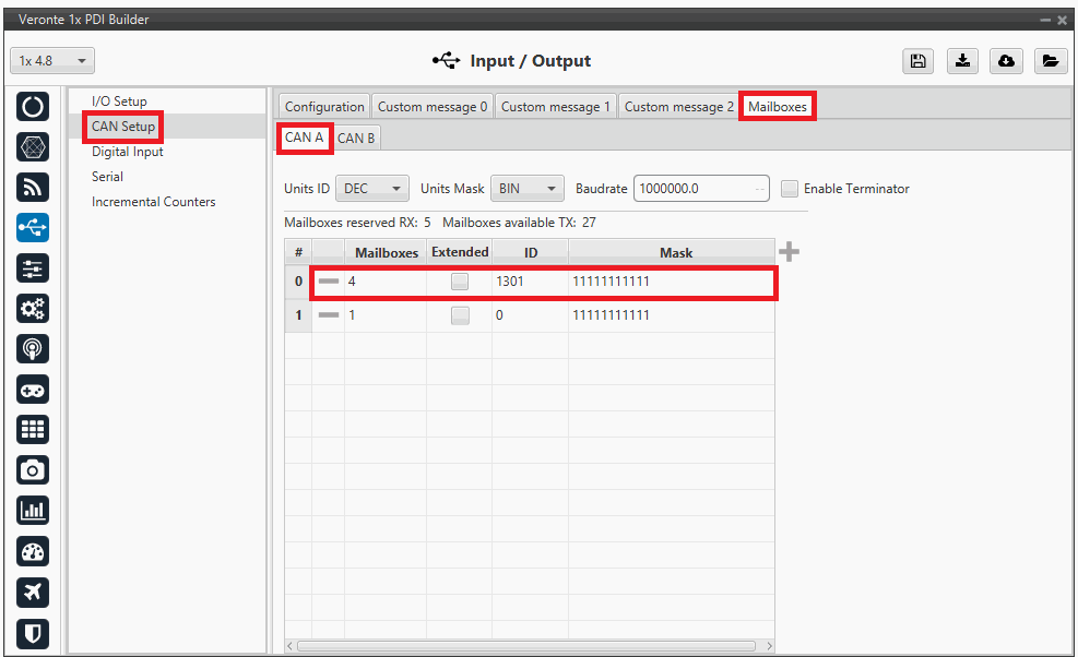 In this example, 4 mailboxes are added for CAN A with ID 1301, according to the MEX configuration carried out in CAN - MEX as External magnetometer for Autopilot 1x in the Integration examples section of MEX PDI Builder manual.