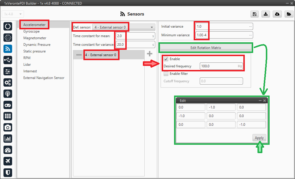 Then, External sensor 0 should be automatically added to the accelerometers list. Select it and configure it as follows: