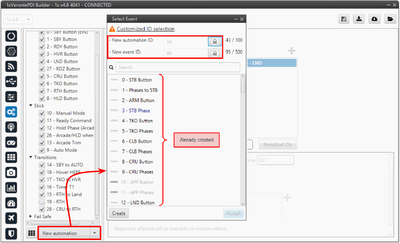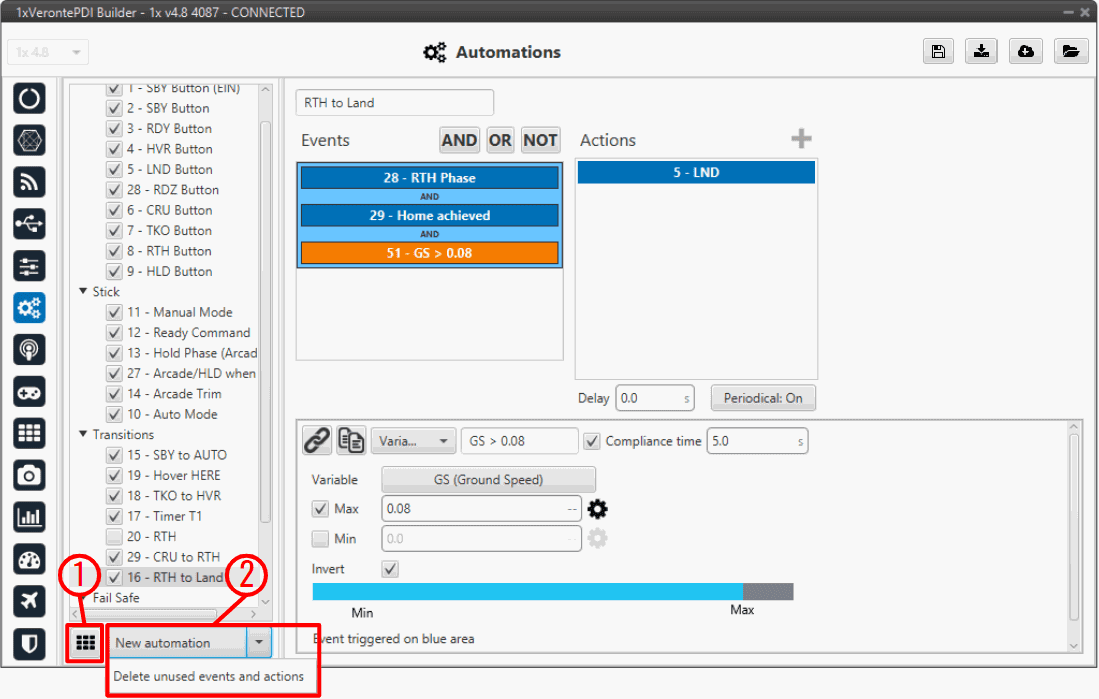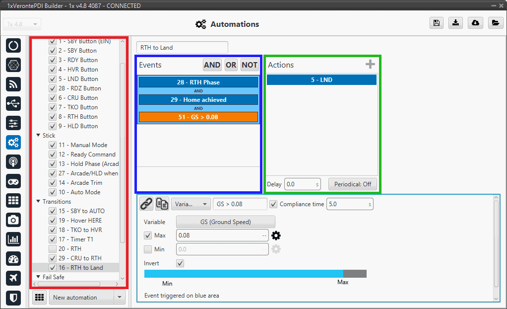Automations are actions that are carried out when a combination of events happen, i.e when the events are accomplished the action is done. An example of what an automation could be a change of phase when reaching a certain altitude and speed, moving a servo when a button is clicked and many other possible combinations.