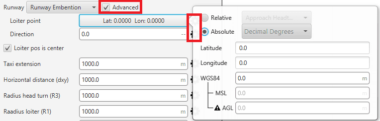 Runway and Loiter position: Here the user can define the loiter and runway positions and direction. However, the default option is to define them in the Runway option of Veronte Ops (for more information, see Veronte Ops manual).