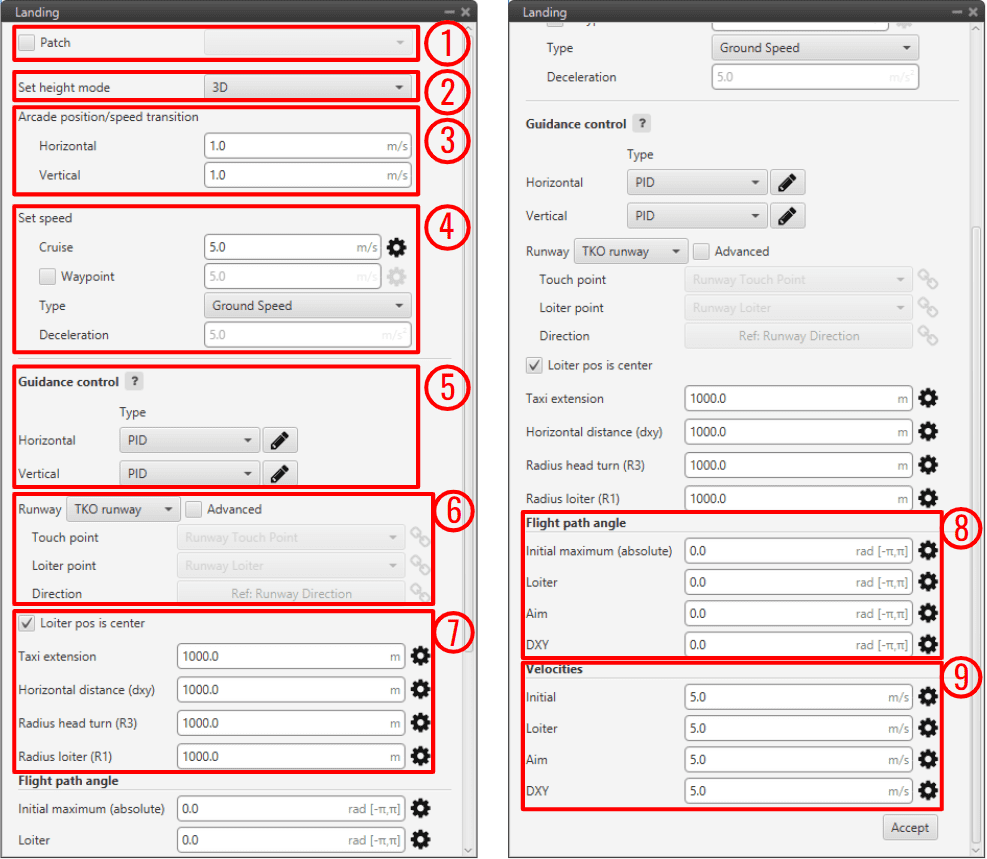 Patch 0: This patch is generated from the point the landing phase is entered to where the loiter is located. Variables that influence this patch are , altitudes and , and Loiter point position.
