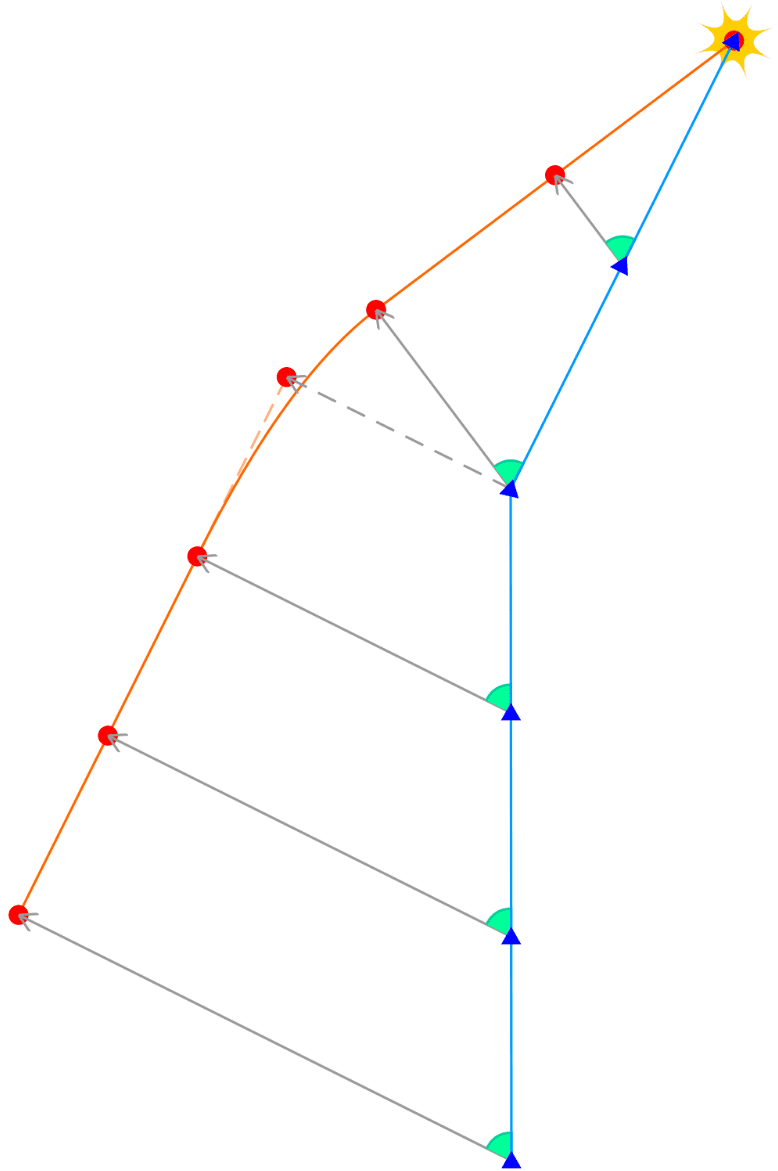 PNav algorithm: A missile (blue) intercepts a target (red) by maintaining constant bearing to it (green) -