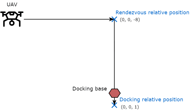 Rendezvous relative position: 3D point used to configure the meeting point for the 1x air unit. This point will be tracked by the vehicle and, once reached, it will start travelling to Docking relative position. For VTOL, X and Y components must be equal.